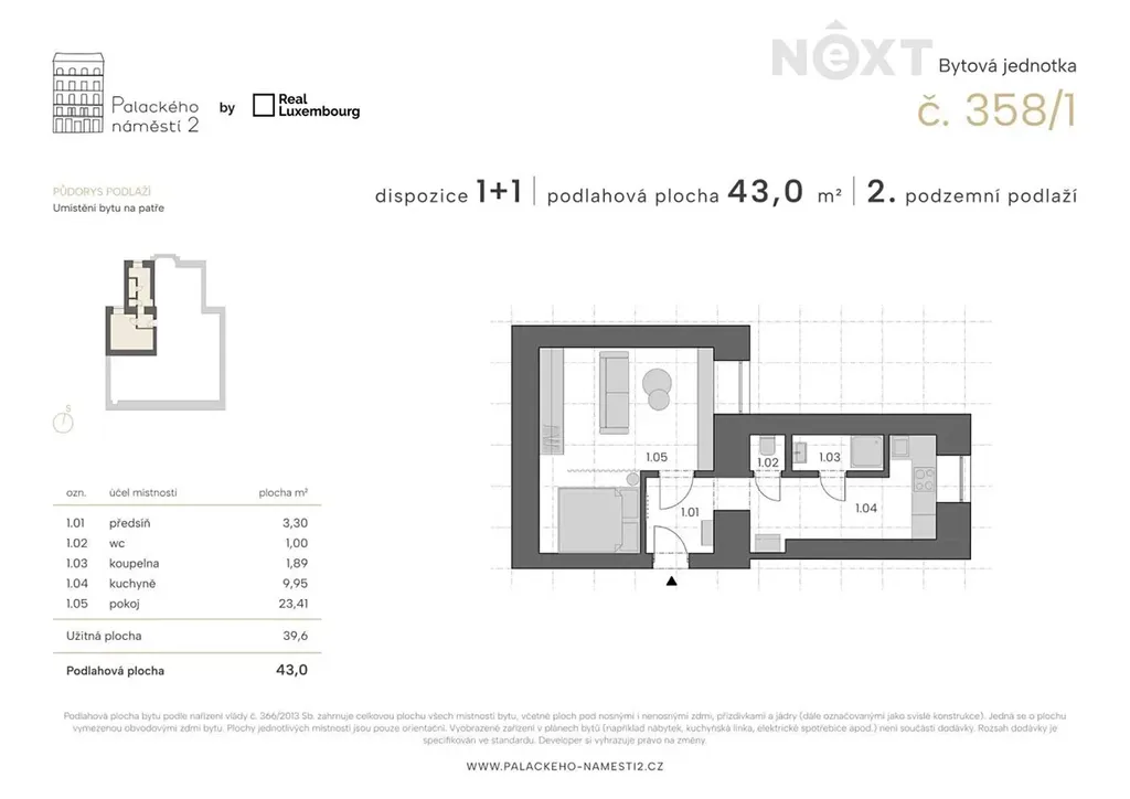 Obě jednotky se nachází na jednom podlaží s vchody naproti sobě, předzahrádky (2 x 80 m2) lze spojit v jeden celek. Nemovitost se nachází na jedinečném místě, Palackého náměstí v centru Prahy. Byty jsou ve 2. podzemním podlaží (okna do klidného vnitrobloku) dobře udržovaného historického domu.