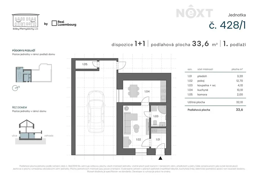 Moderní 1+1 (32 m²) s parkovacím stáním a zděnou komorou.