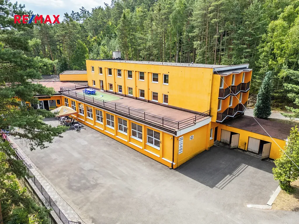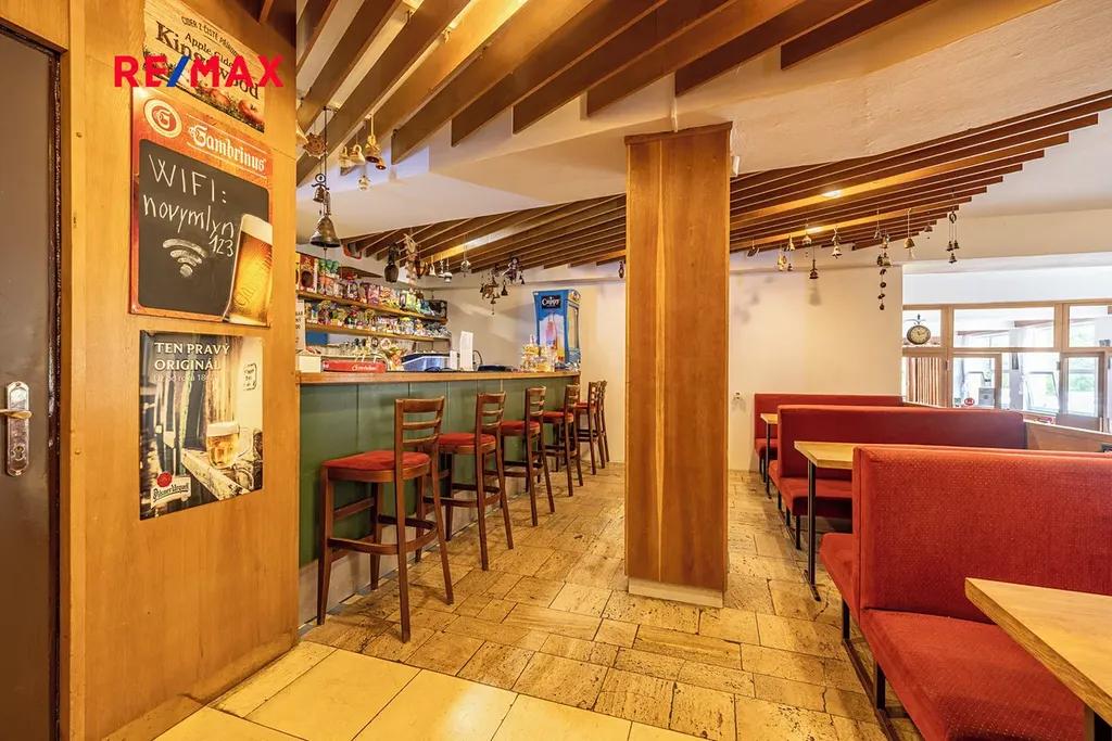 Uvnitř penzionu se nachází vybavená jídelna s kapacitou pro 150 osob, dvě společenské místnosti a prostorný multifunkční sál, ideální pro cvičení, projekce, divadelní představení či firemní akce. Kvalitně vybavená kuchyně umožňuje zajištění stravovacích služeb. Součástí komplexu je také bar s příjemným posezením a terasa v 1. patře, která slouží k odpočinku. Dále je k dispozici samostatná recepce/kancelář a soukromý byt 3 + 1 s vlastním vstupem vhodný pro správce nebo majitele. Menší posilovna se sprchami přidává další hodnotu této nabídce.