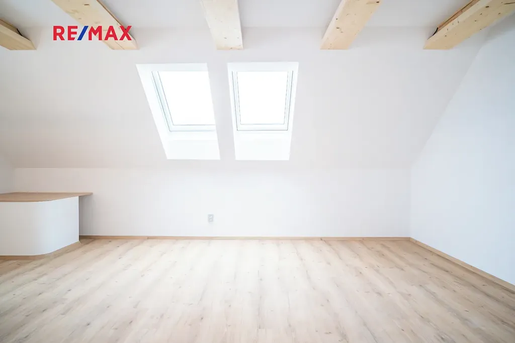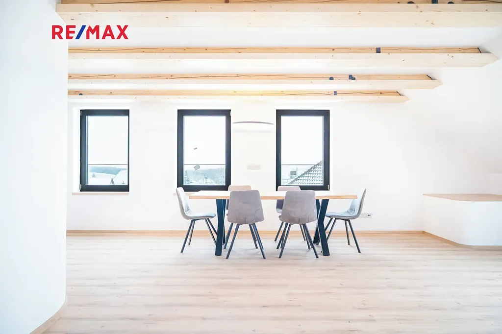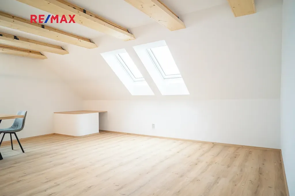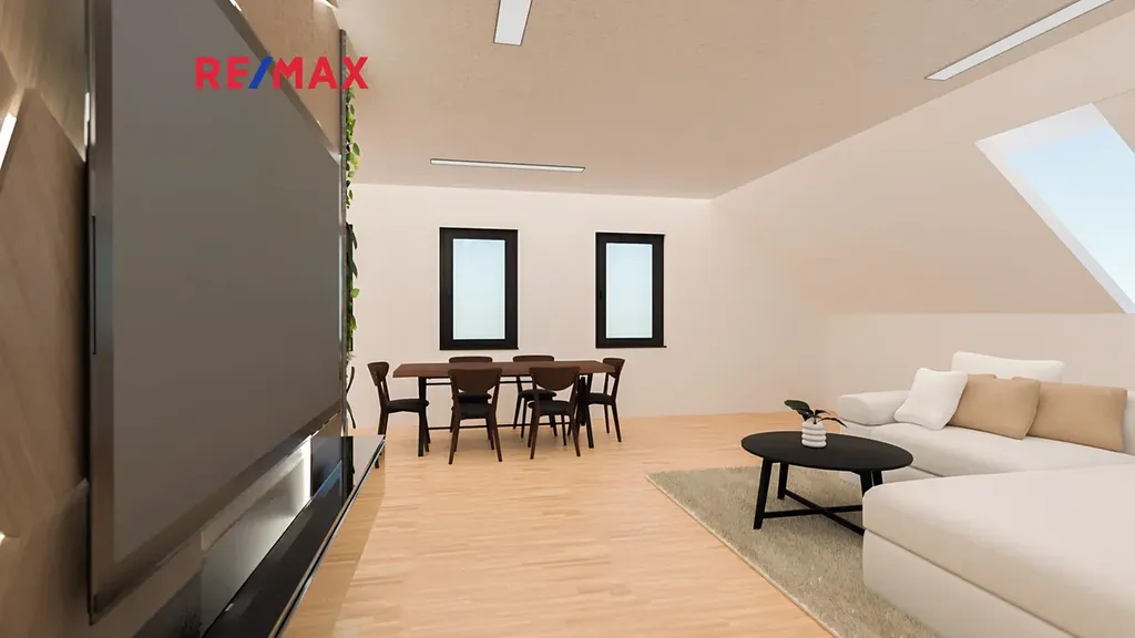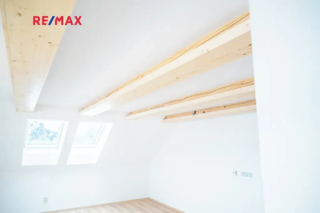 Na kuchyň navazuje stylový obývací pokoj, který v sobě krásně spojuje současný design a přiznané prvky dřeva — prostor působí vzdušně, ale zároveň příjemně útulně. V této části naleznete také samostatné WC, komoru a prostornou koupelnu s vanou i sprchovým koutem. Kromě toho jsou zde dva oddělené pokoje — skvělá volba pro dětské pokoje, pracovnu či hostinský pokoj.
