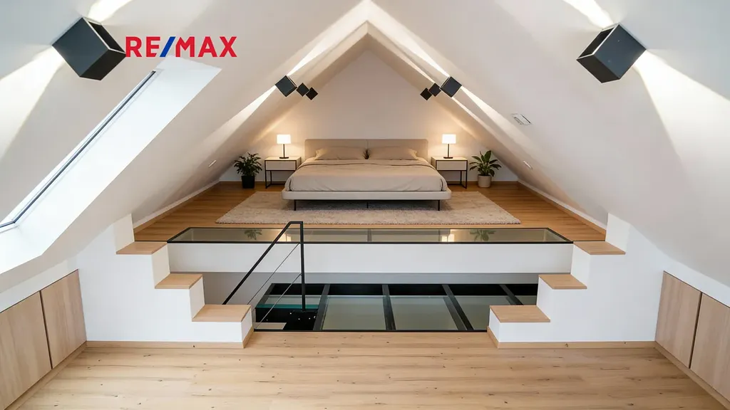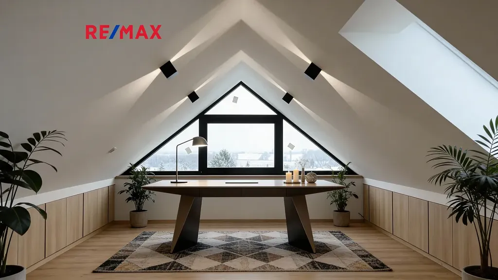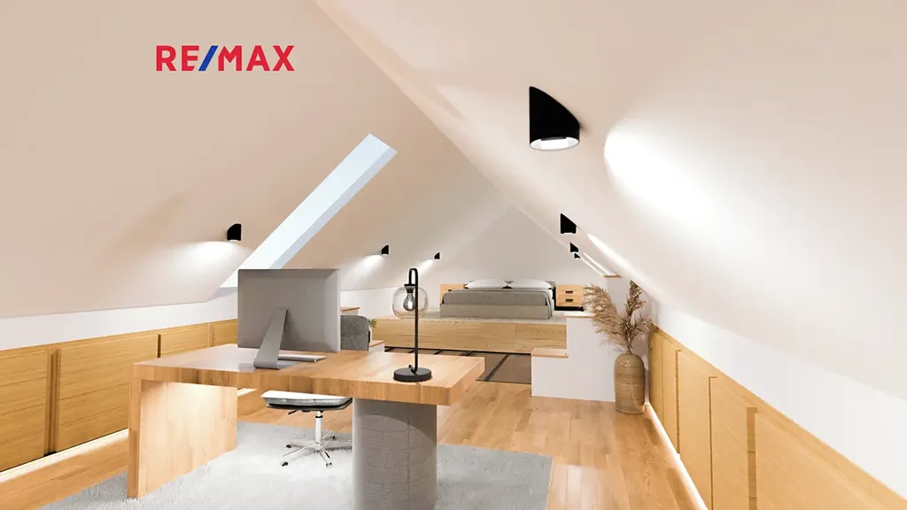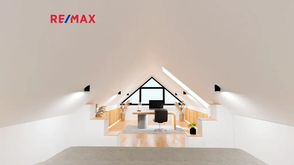 V horním patře se nachází velkoryse řešená ložnice s pracovnou, jejímž největším benefitem je opravdu unikátní panoramatický výhled do krajiny. Jde o prostor, který nabízí dokonalé zázemí pro odpočinek i práci z domu — inspirace je tady doslova na dosah ruky.