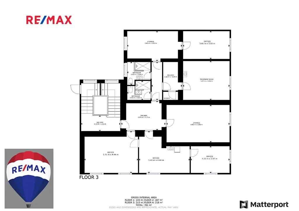 Celková užitná plocha nemovitosti cca 800 m², jedno podzemní a tři nadzemní patra.