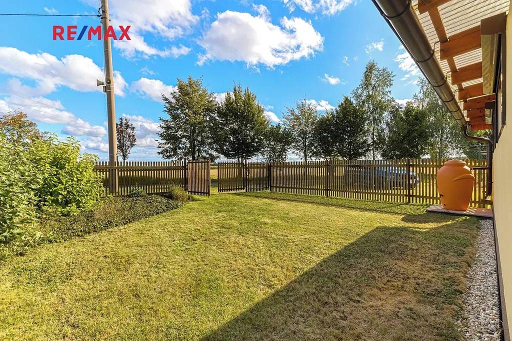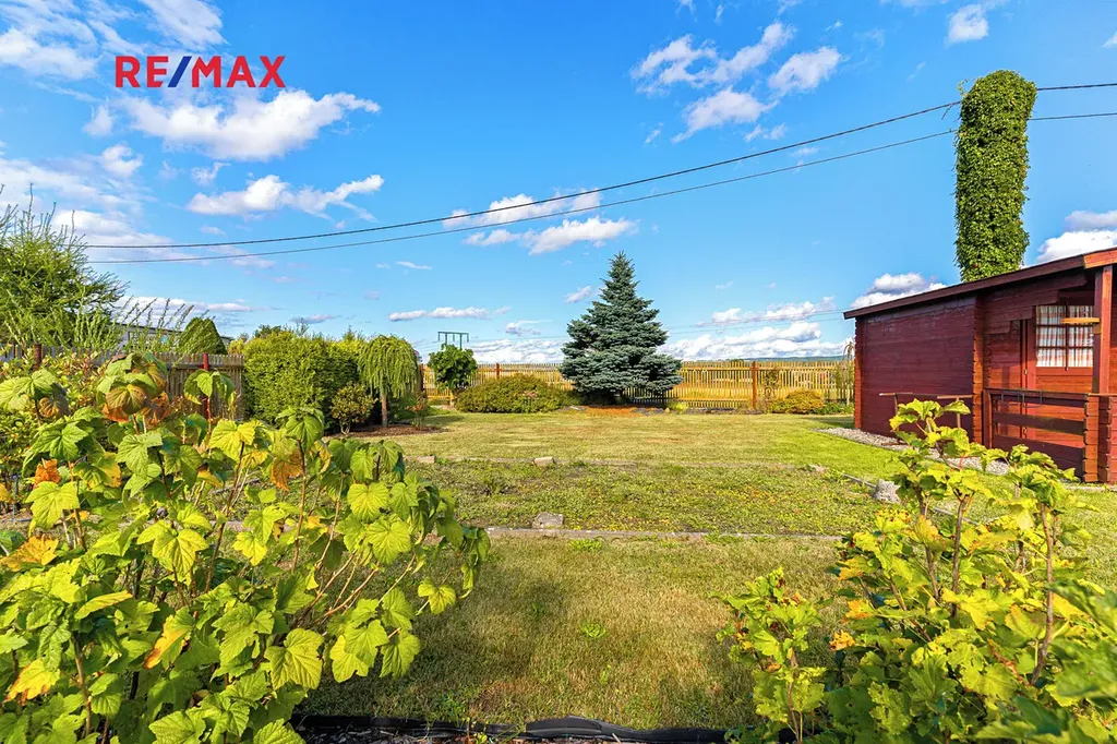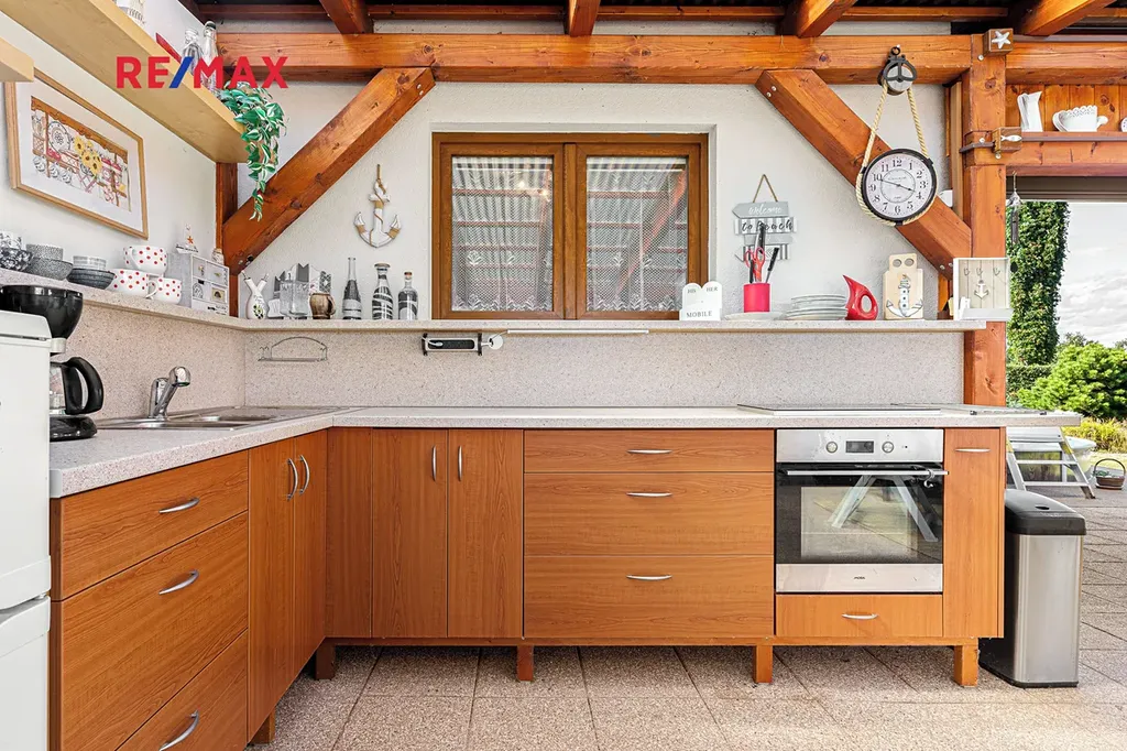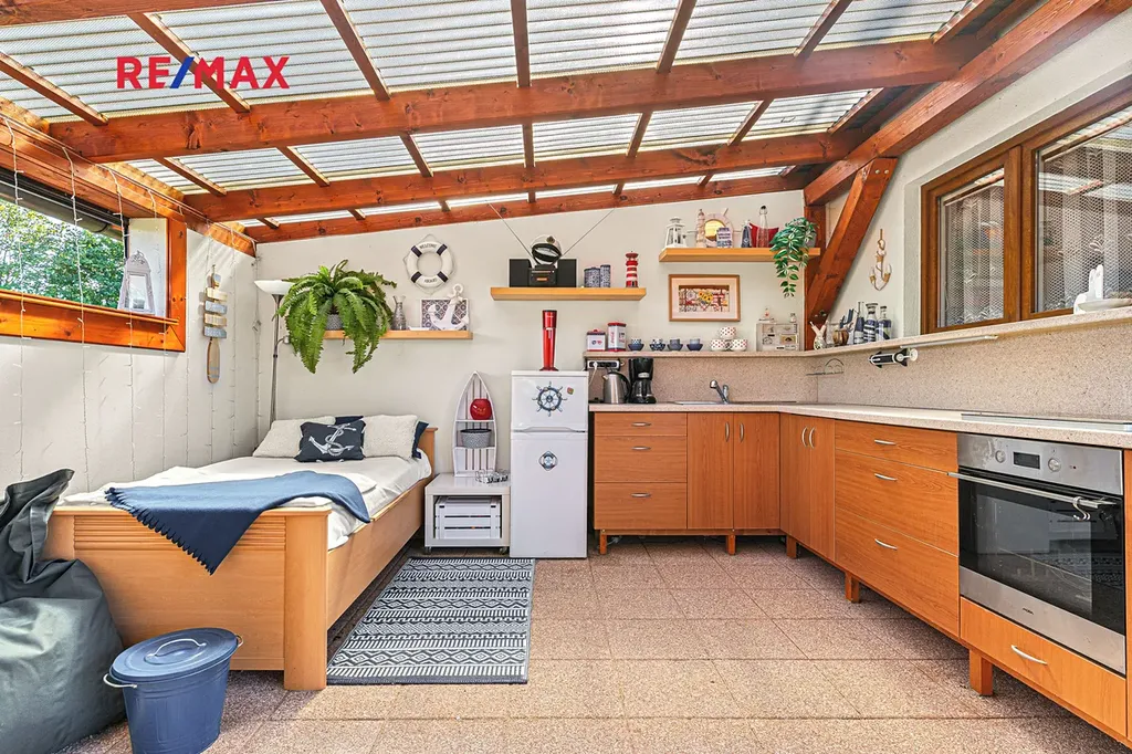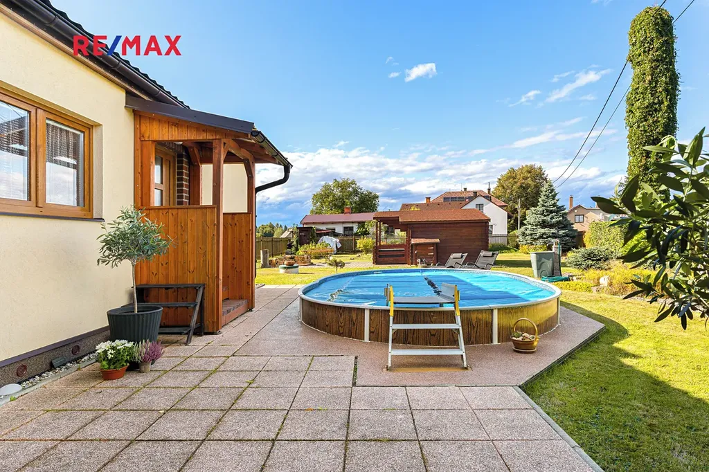 Díky elektrickým roletám lze pergolu snadno uzavřít a využívat ji i za horšího počasí. Na zahradě je bazén o ploše 20 m2, který v létě potěší děti i dospělé. Okrasné záhony, skalka, vzrostlé keře a stromy dotvářejí příjemnou atmosféru. Vše efektivně doplňuje zahradní domek o velikosti cca 14 m2, který může sloužit jako místo pro hosty nebo sklad zahradního náčiní.