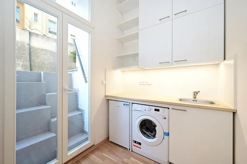 Byt je orientován západním směrem, je tedy velmi tichý. Pokoj je zela nová rekonstrukce, koupelna s mramorovým umyvadlem původní. Díky výborné dostupnosti na metro a tramvajový uzel ideální jako městské bydlení. Současně velká terasa uspokojí téměř všechny nároky na volný čas.