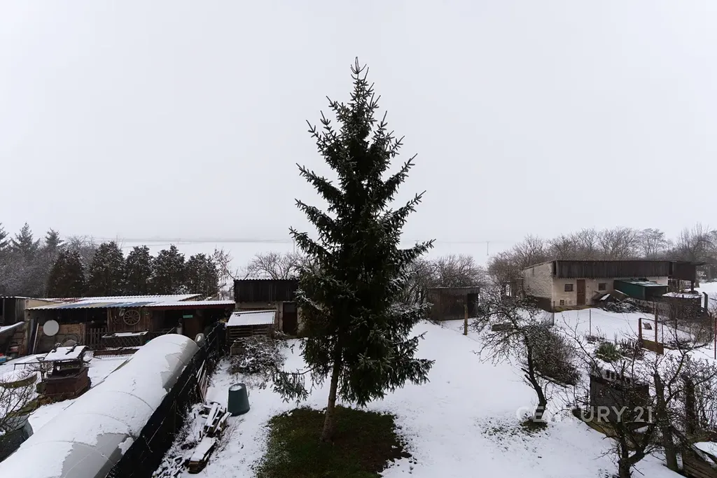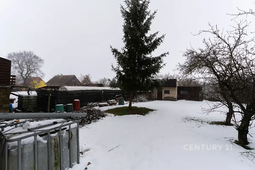 K domu náleží rovinatá, oplocená zahrada s hospodářským zázemím, která nabízí soukromí a nerušený výhled do otevřené krajiny.