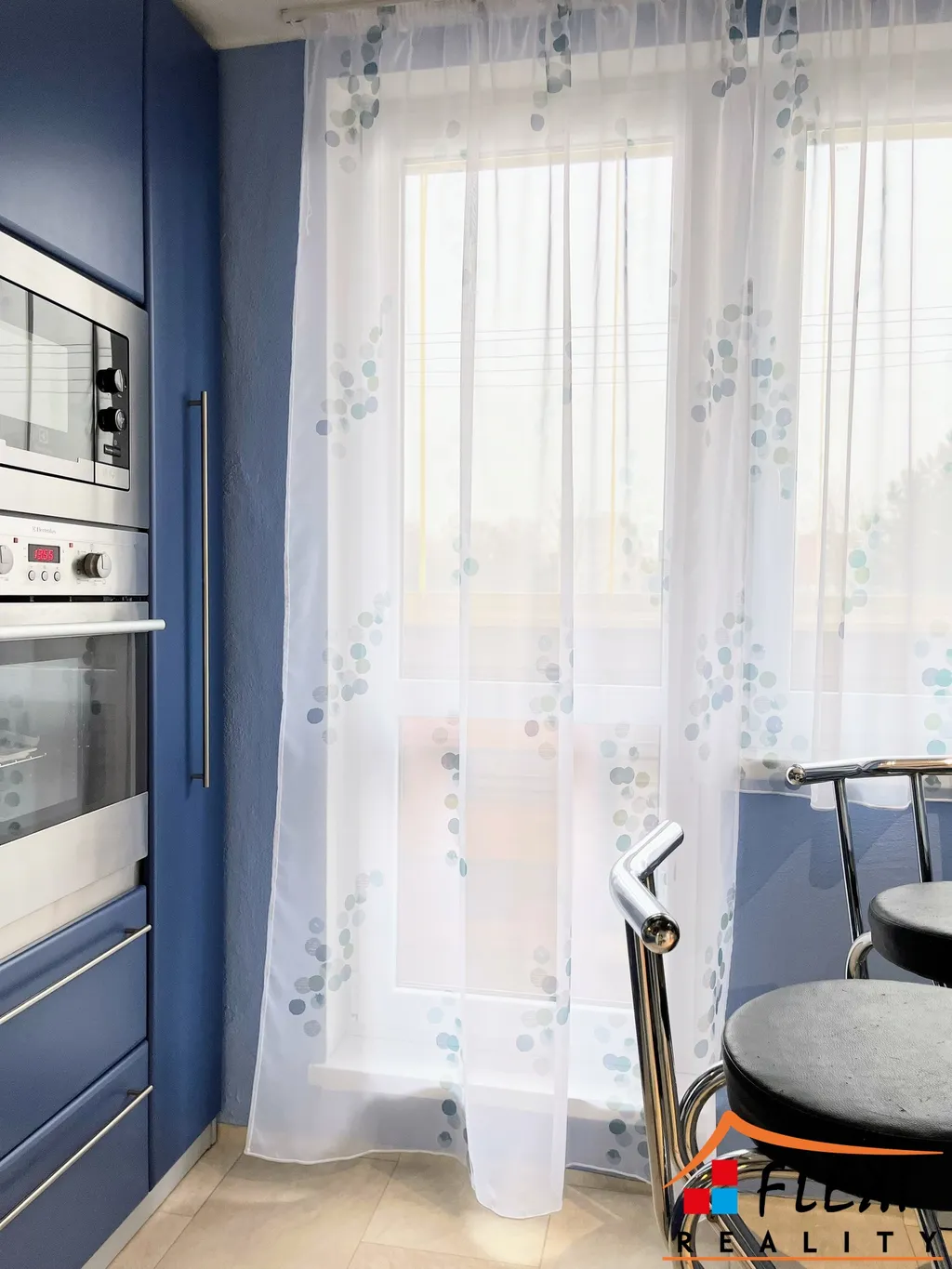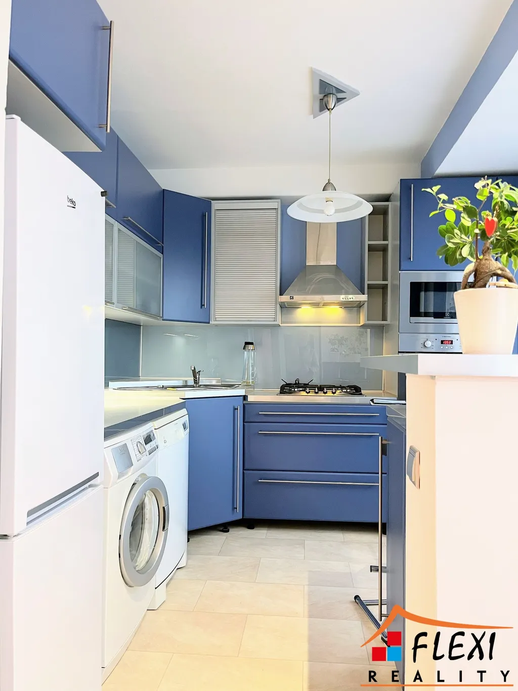 Byt se nachází v klidném domě ve 3p/17p se 2 výtahy. Kuchyňská linka na míru disponuje plynovou varnou deskou, digestoří, mikrovlnnou troubou, el. troubou s grilem, lednicí, myčkou, pračkou a barovým pultem s židlemi.