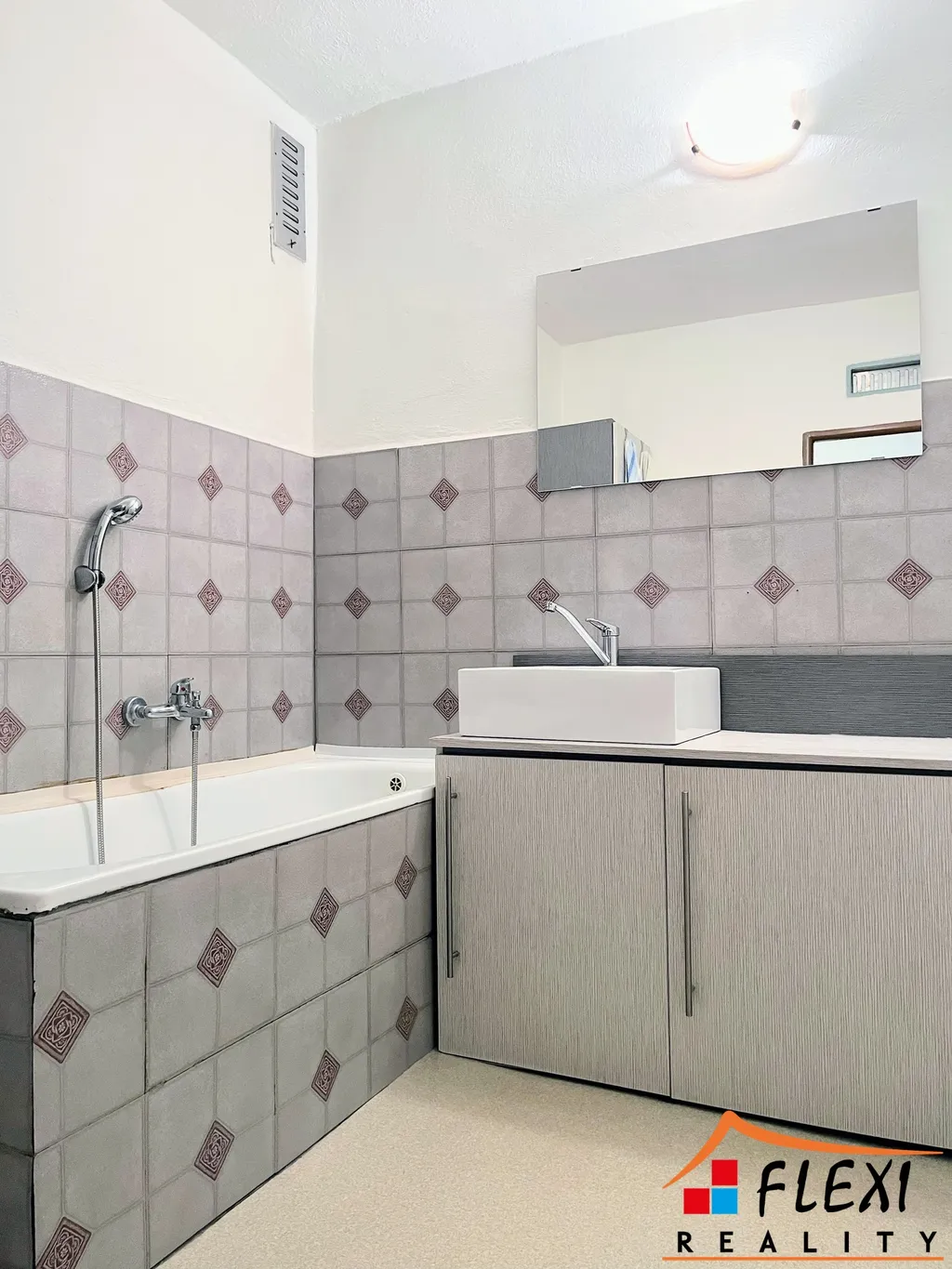 Prostorná zděná koupelna s vanou a úložnou skříňkou. WC samostatné.