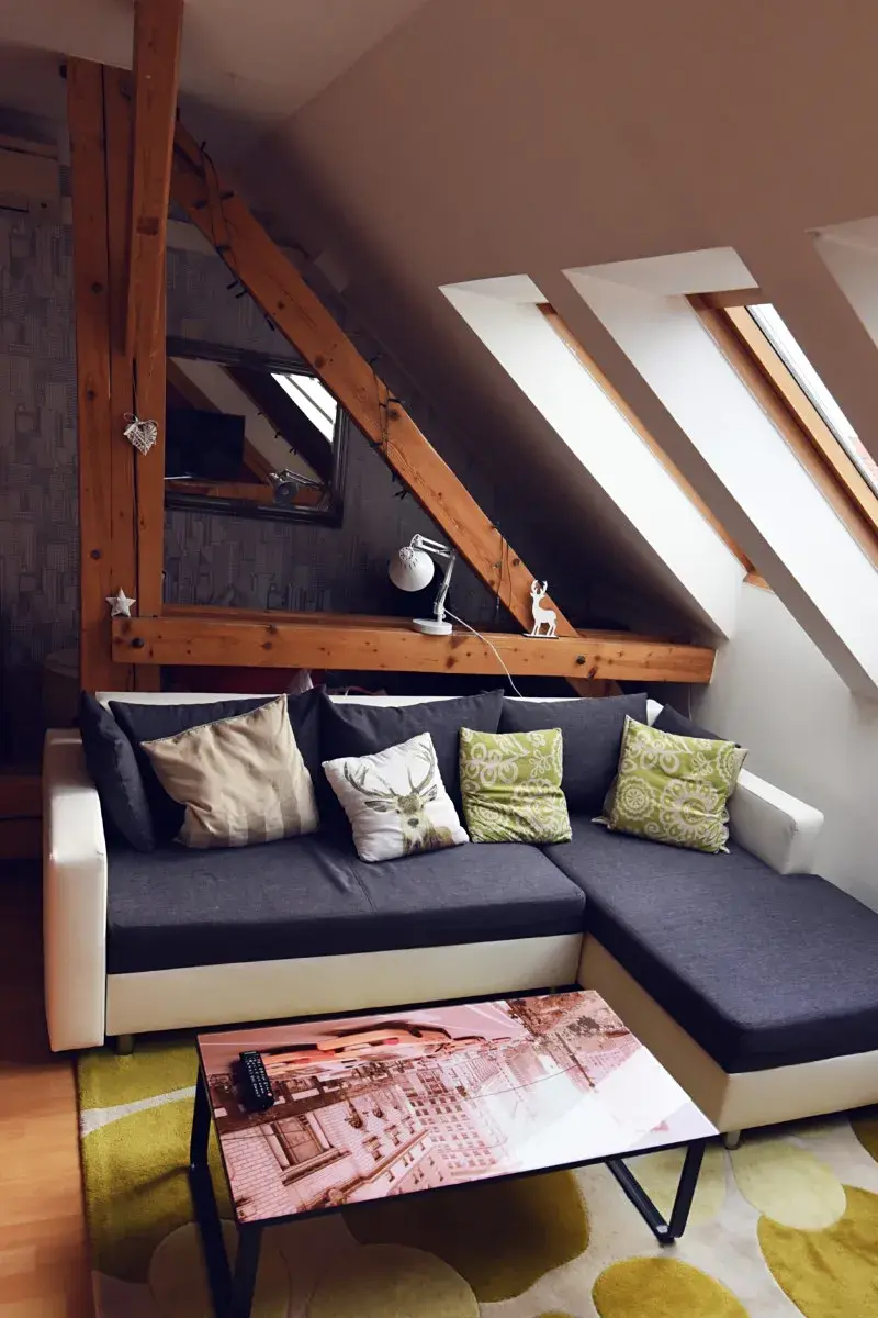 Velkou předností bytu je jeho kompletní vybavení nábytkem na míru, který efektivně využívá podkrovní prostor. Dispozice zahrnuje vstupní chodbu, kuchyni s jídelním stolem, koupelnu se sprchovým koutem a WC. Srdcem bytu je obývací pokoj, který je vybaven klimatizací, což oceníte zejména v letních dnech.