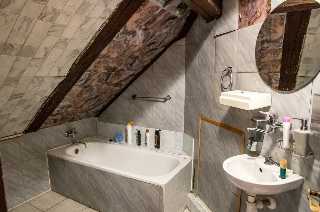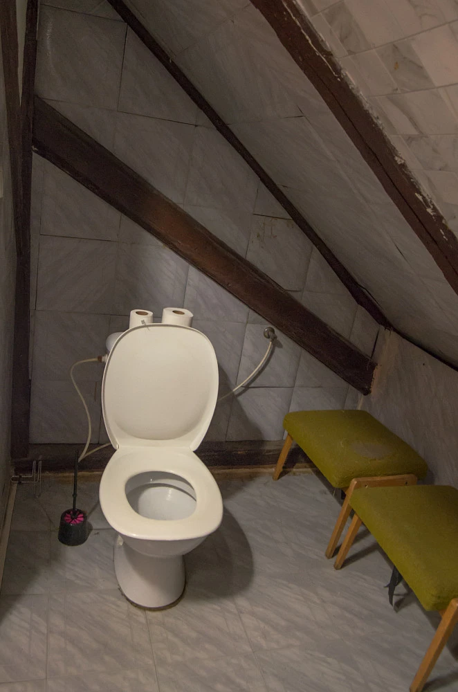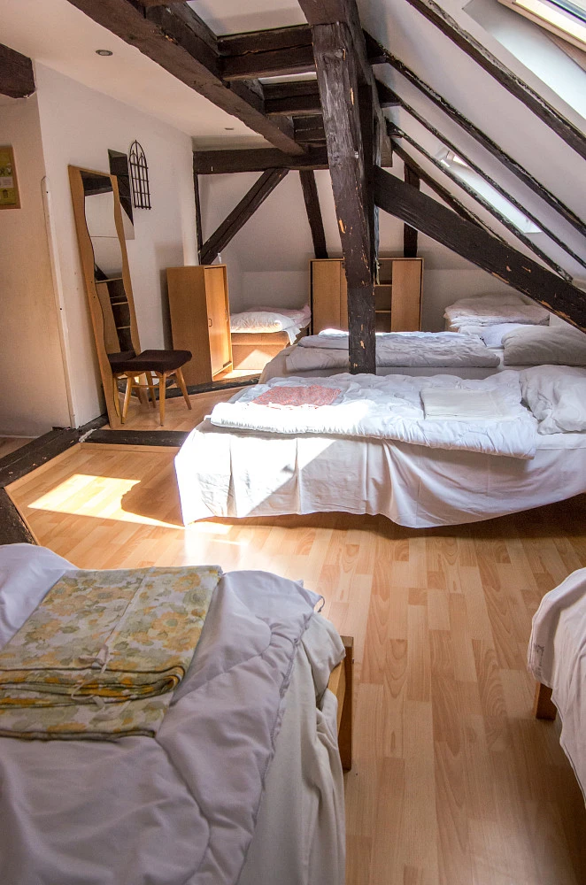 V patře se nachází 7 ložnic – 3x3 lůžka, 3x2 lůžka, 1 pokoj s 8 lůžky a sociálním zařízením – koupelna s vanou a WC a bojlerem na teplou vodu, v patře je ještě druhé WC.