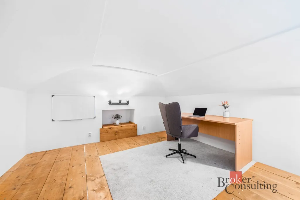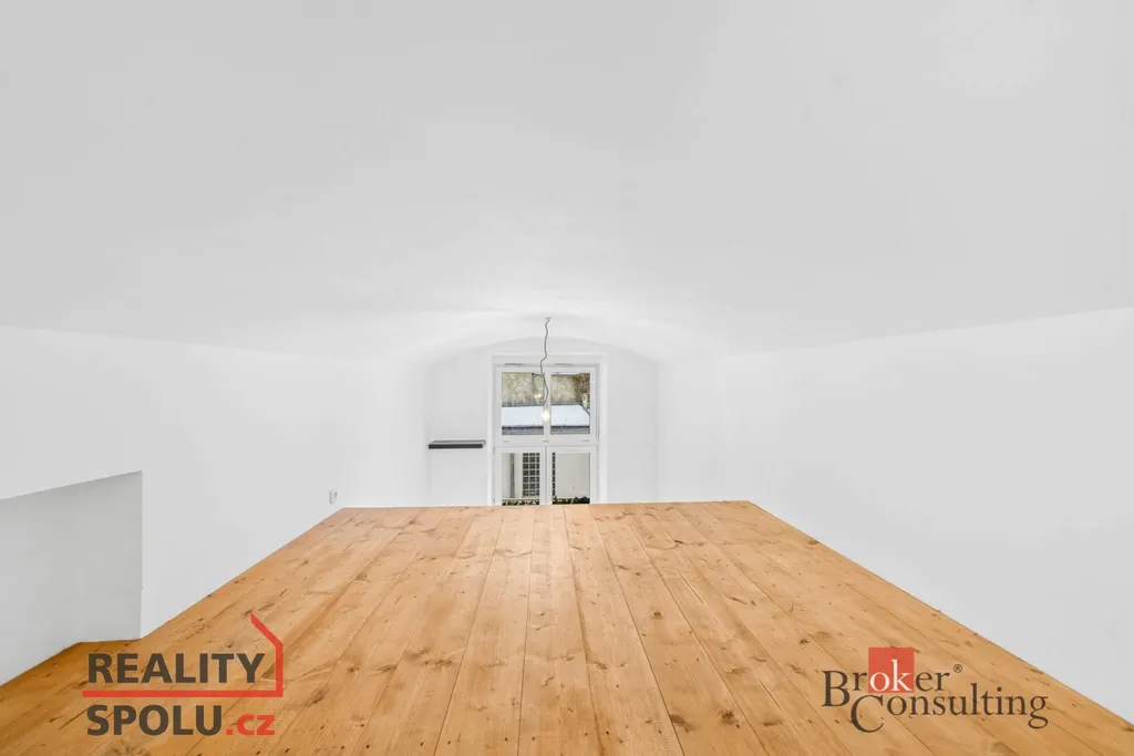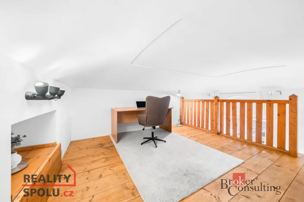 Jedno patro slouží klasicky jako prostor na spaní, druhé je řešeno velmi chytře – může fungovat jako pracovna, knihovna nebo klidová zóna (výška stropu od 150 cm do 180 cm) Ideální kombinace bydlení a home office, případně investiční využití.