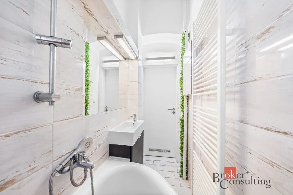 Interiér je laděn do světlých tónů, kombinace bílých stěn a masivního dřeva vytváří nadčasový, lehce industriální až loftový charakter. Byt je ihned obyvatelný bez nutnosti větších investic.