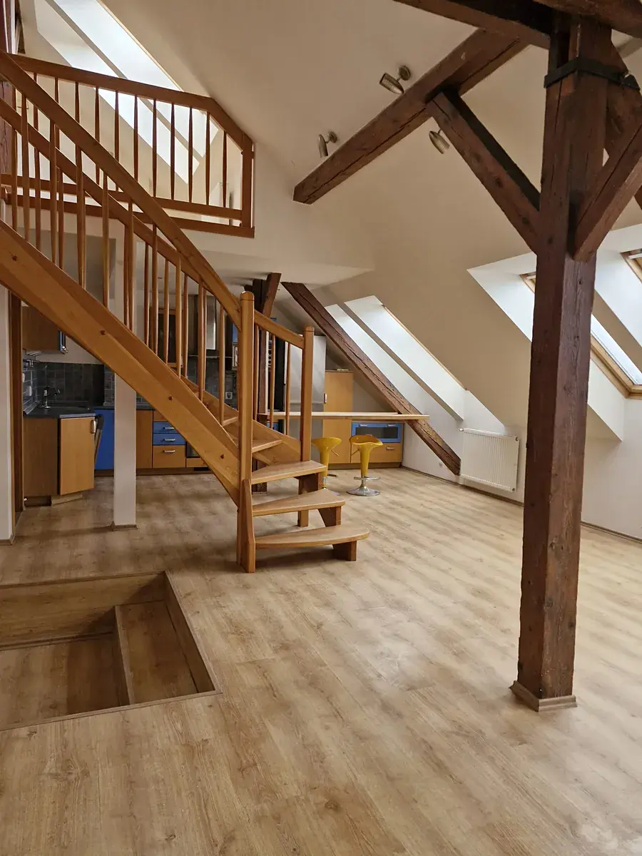 Nabízíme k dlouhodobému pronájmu světlý půdní byt 2+kk+galerie (pracovna) o celkové velikosti 95 m2 + 5 m2 sklep v udržovaném činžovním domě v Malířské ulici. Byt se nachází v 5.patře domu bez výtahu. Dispozičně je řešen: vstupní předsíň, prostorný obývací pokoj s plně vybavenou kuchyní (lednice, myčka, mikrovlnná trouba, varná deska a elektrická trouba) a schody na otevřenou galerii (23 m2), samostatná ložnice, koupelna s vanou a samostatná toaleta. V rámci koupelny je umístěna pračka a plynový kotel na topení a ohřev vody. Okna z obývacího pokoje jsou do ulice Malířské, z ložnice do klidného vnitrobloku. Místnosti jsou neprůchozí se samostatnými vstupy. V rámci předsíně a obývacího pokoje jsou vestavěné skříně. Byt je vybaven klimatizací.