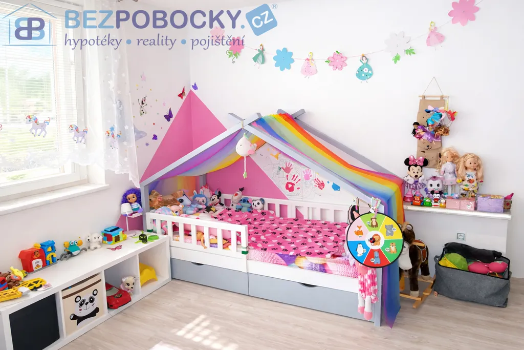 Po prostorném světlém schodišti se dostaneme do patra domu a zde se nachází hlavní ložnice, která disponuje vlastní šatnou a další místností kterou lze použít dle představ nového majitele. V patře se dále nacházejí další tři velkorysé pokoje, které mají dostatek přirozeného světla. Dva pokoje v současné době slouží jako dětské a třetí jako posilovna. Dále je zde velice prostorná koupelna se sprchovým koutem a rohovou vanou. Z koupelny přístupná prostorná prádelna s technickou místností skrývá pračku, sušičku, bojler na teplou vodu, elektrický kotel a akumulační nádrž na teplou vodu, která je napojena a ohřívána krbem.