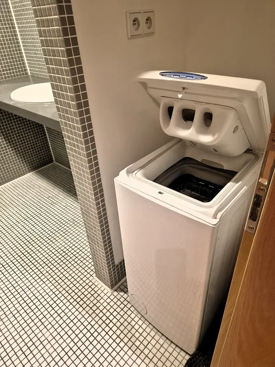 Koupelna se sprchovým koutem a pračka s horním plněním prádla.