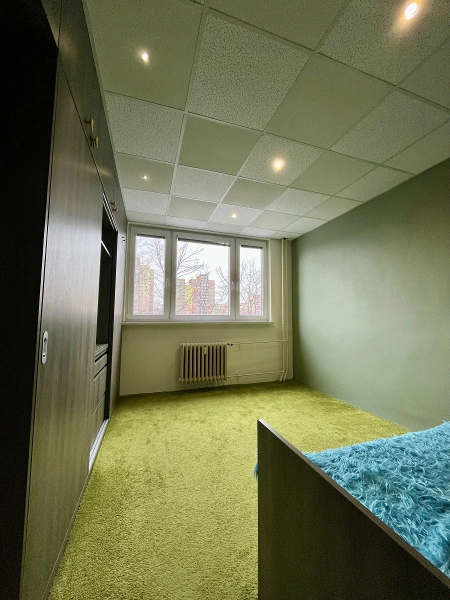 Dispozice bytu zahrnuje dva stejně velké, prostorné a neprůchozí pokoje, z nichž z jednoho je vstup na zasklený balkon. Jeden z pokojů je vybaven vestavnou skříní s postelí.