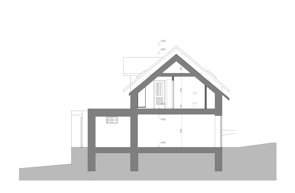 Horní patro je řešeno jako dvě samostatné bytové jednotky se společnou chodbou: