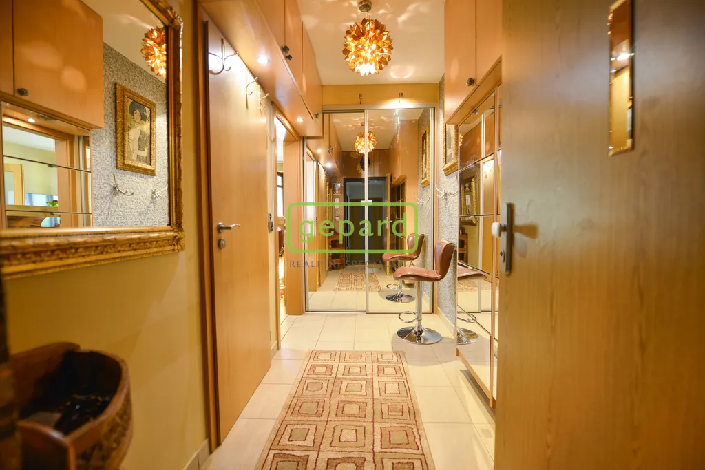 Byt 4+kk se nachází v prvním podlaží v budově s výtahem. Má vstupní chodbu, samostatné wc, obývací pokoj s kuchyňským koutem, terasou a 3 neprůchozí pokoje. V koupelně s dalším wc a sprchovým koutem i vanou, pračkou je místo i na případnou sušičku. Kuchyň je plně vybavena jak spotřebiči tak i nádobím. Byt má užitnou plochu 93 m2 + balkon 8 m2. K bytu náleží sklep a garážové stání v suterénu. Dohromady jde o plochu 116 m2.