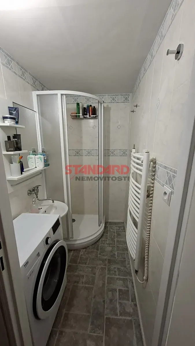 V koupelně je sprchový kout, umyvadlo a přípojka na pračku.