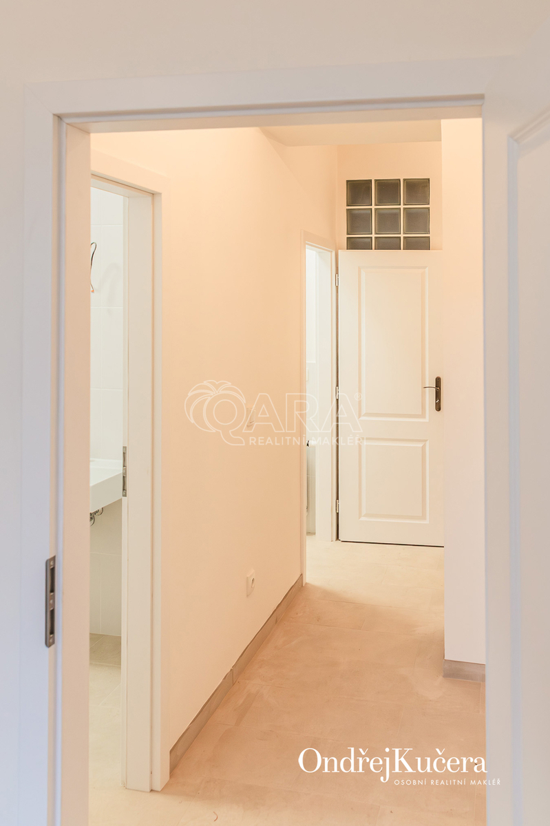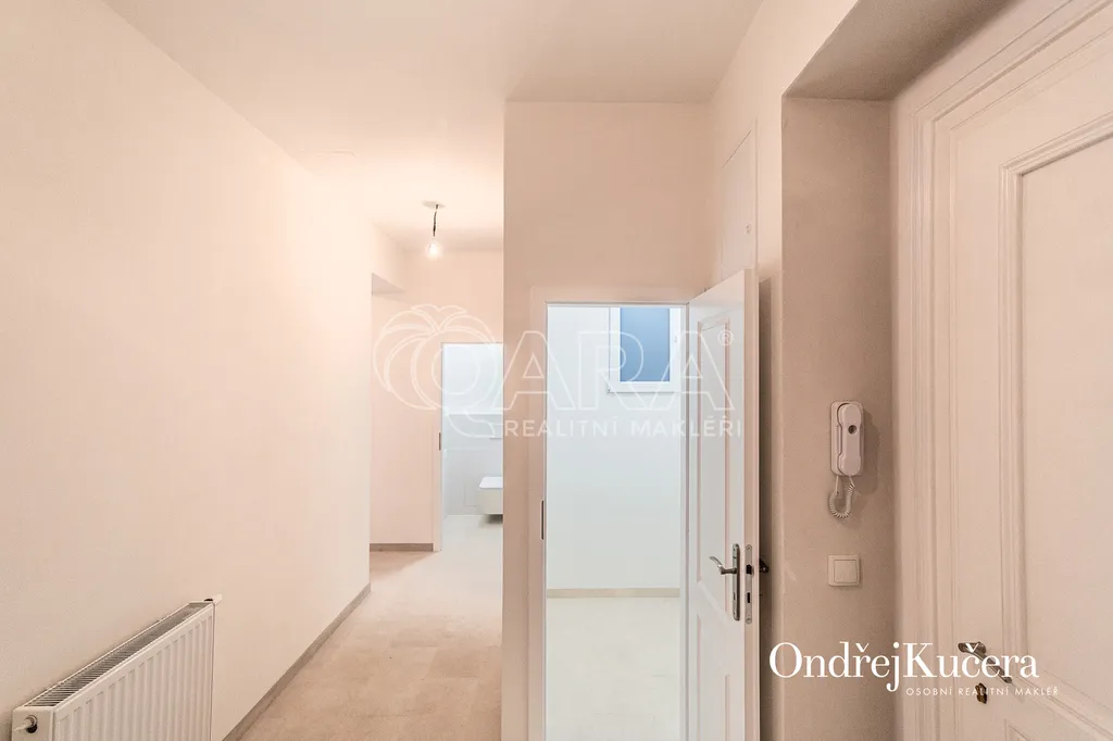 Byt s vysokými stropy má a dva neprůchozí pokoje s původními leštěnými parketami. V jednom je plně vybavený kuchyňský kout. Prostorná předsíň se vstupy do všech místností, do komory s plynovým kotlem na topení a ohřev vody, do koupelny s přípojkou na pračku, umyvadlem a sprchovým koutem a vedle na samostatnou toaletu.