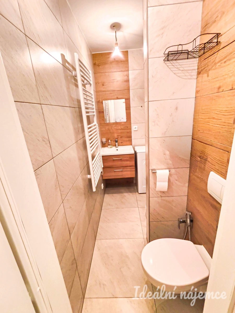 Dále se zde nachází ložnice s postelí a skříní. Z ložnice je vstup na balkon. V koupelně se nachází sprchový kout, umyvadlo, zrcadlo, pračka a wc. K dispozici je i šatna. V bytě jsou vinylové podlahy. Vytápění zajišťuje ústřední vytápění s radiátory.