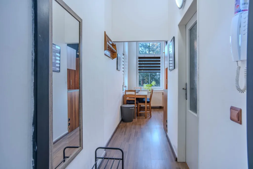 Byt disponuje vstupní chodbou s přímým vstupem do kuchyně s jídelnou, koupelnou s WC a sprchovým koutem a obytným pokojem, kde je umístěno horní spaní s prakticky skrytou šatnou. Vestavěné skříně a spotřebiče jsou součástí pronájmu.