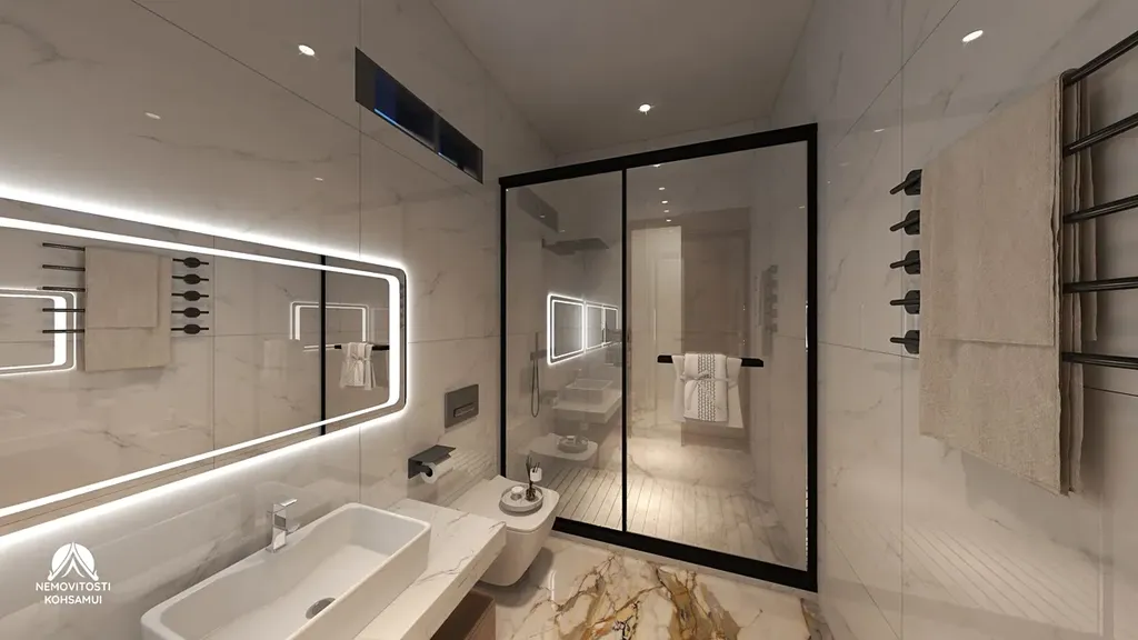 Každá vila se pyšní prostornou plochou 180 m² a disponuje 3 ložnicemi a 3 koupelnami, čímž zaručuje komfortní ubytování pro celou rodinu.
