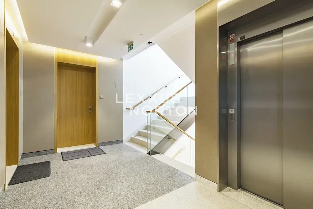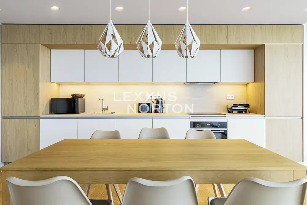 Tento reprezentativně zařízený byt s moderním interiérem je vybaven klimatizací a vestavěnými skříněmi. Kuchyňský kout disponuje kompletním vybavením – sklokeramickou deskou, troubou, lednicí s mrazákem a myčkou nádobí. Byt nabízí dvě designové koupelny – jedna je vybavena vanou a toaletou, druhá sprchovým koutem, toaletou, pračkou a sušičkou.
