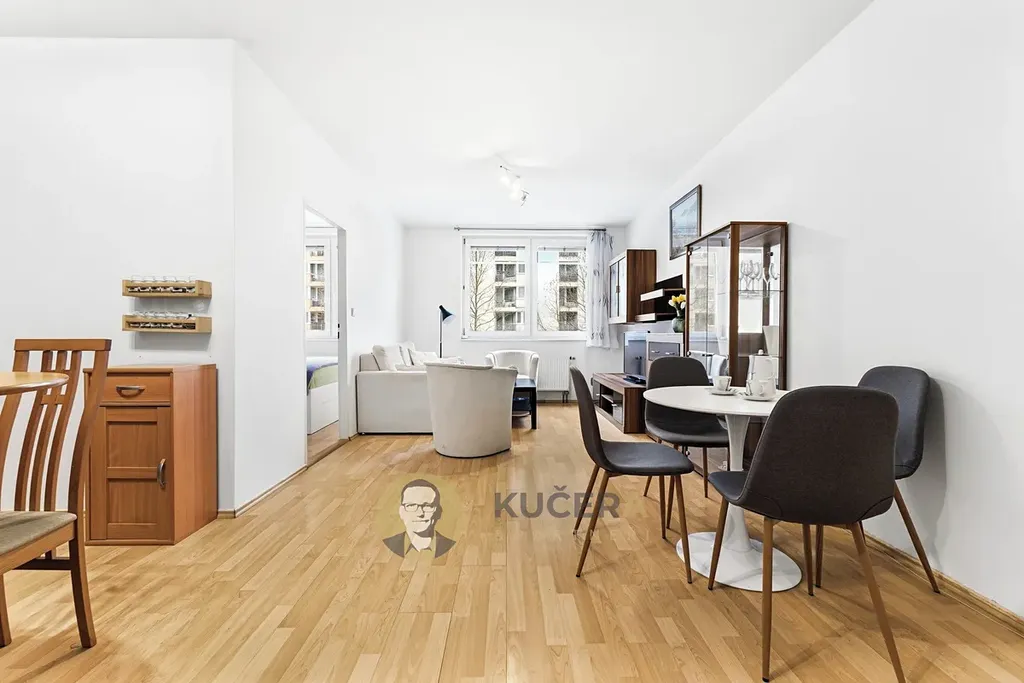 Byt je dispozičně přehledný. Obývací pokoj s kuchyňským koutem tvoří hlavní obytnou část, samostatná ložnice zajišťuje dostatek soukromí. Součástí bytu je nábytek na míru (šatní skříně v chodbě a ložnici), který zůstává součástí prodeje. Navíc je k bytu k dispozici zděný sklep o velikosti 3,9 m².