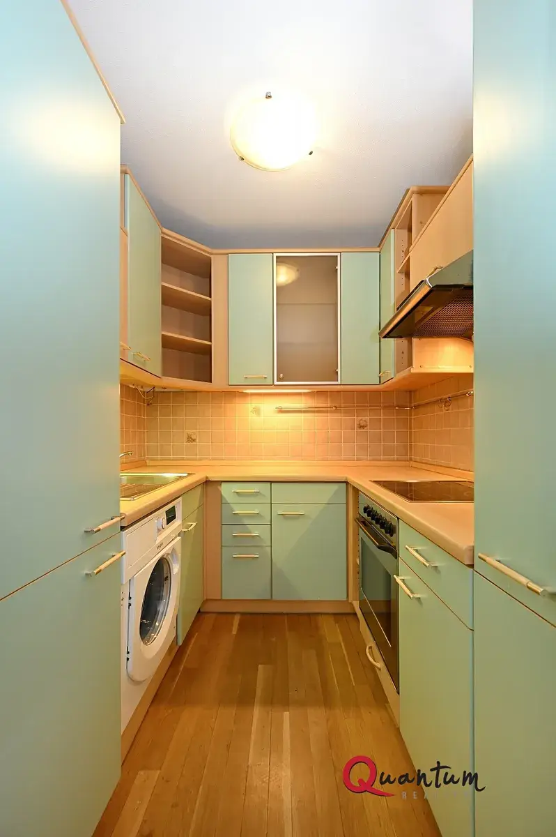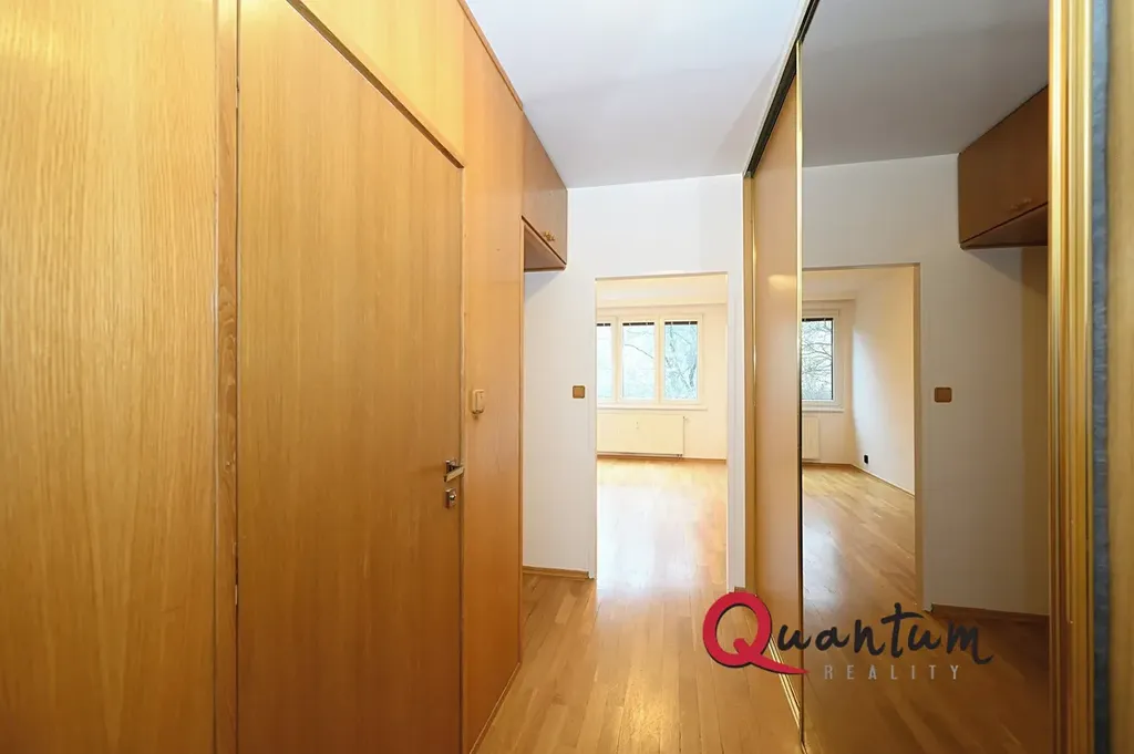Byt je ve výborném stavu a je nabízen nezařízený. Sestává ze 2 pokojů (orientovaných na jih), kuchyňského koutu s kuchyňskou linkou s vestavěnými spotřebiči - sklokeramická varná deska, el. trouba, lednice s mrazákem a pračka. V koupelně (zděné jádro) je vana společně s WC. V chodbě je dostatek úložných prostor - velká vestavěná skříň a úložný prostor nad dveřmi. Okna jsou plastová se žaluziemi, podlahy dřevěné a dlažba, vytápění ústřední. K bytu náleží i sklep v suterénu domu.
