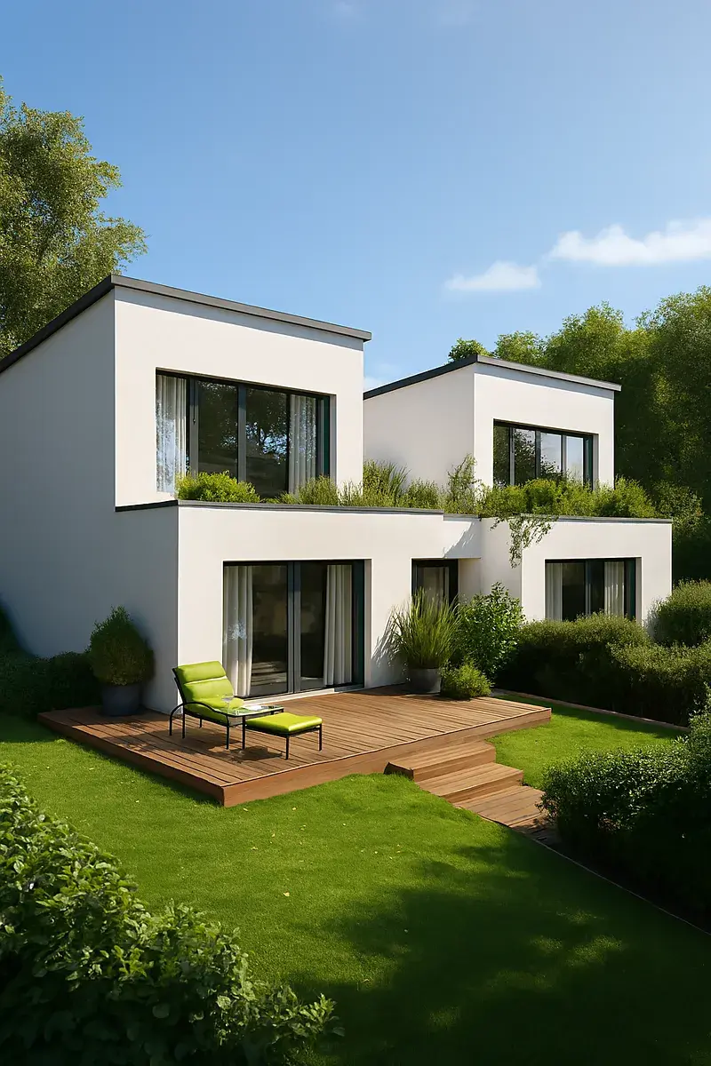 Dvojdům se samostatnými bytovými jednotkami, oddělenými zahradami, protihlukovými stěnami zajišťuje dostatek soukromí.