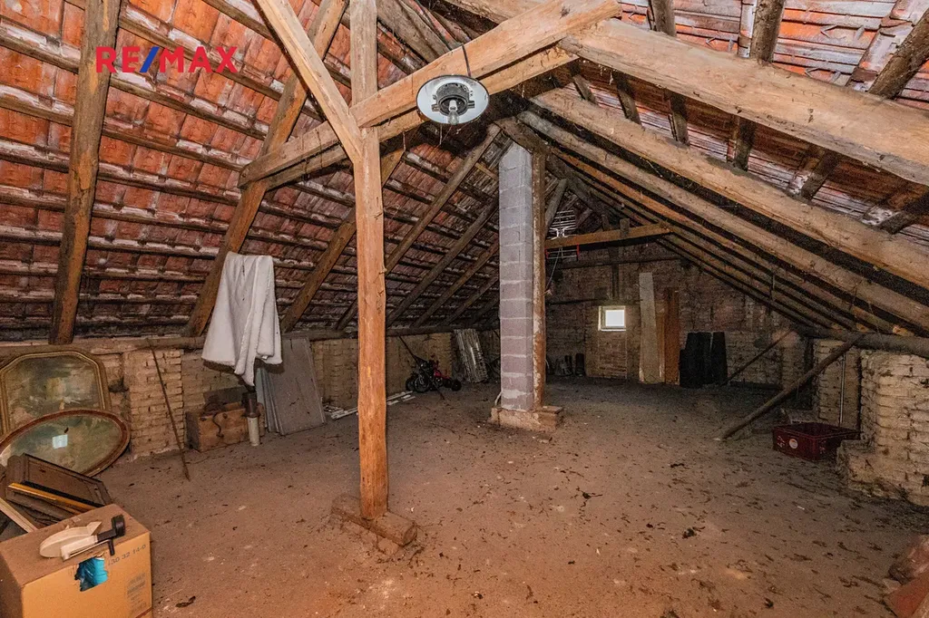 Přízemí nabízí prostorný obývací pokoj, který je propojen s kuchyní. Dále ložnici, koupelnu s WC, praktickou komoru, chodbu a schodiště vedoucí jak na půdu, tak do sklepa. V přízemí je také k dispozici samostatný pokoj s vlastním vstupem zvenčí, který lze využít jako pracovnu nebo pokoj pro hosty. Nad obytným prostorem se nachází rozlehlá půda, s výškou stropu až 3,5 m. Tento prostor skýtá skvělý potenciál pro rozšíření obytné plochy, ať už formou dalších pokojů, ateliéru, domácí kanceláře nebo jako samostatná jednotka určená k pronájmu. Suterén zahrnuje kotelnu a uhlárnu. Tyto prostory slouží jako technické zázemí domu či praktické skladování.