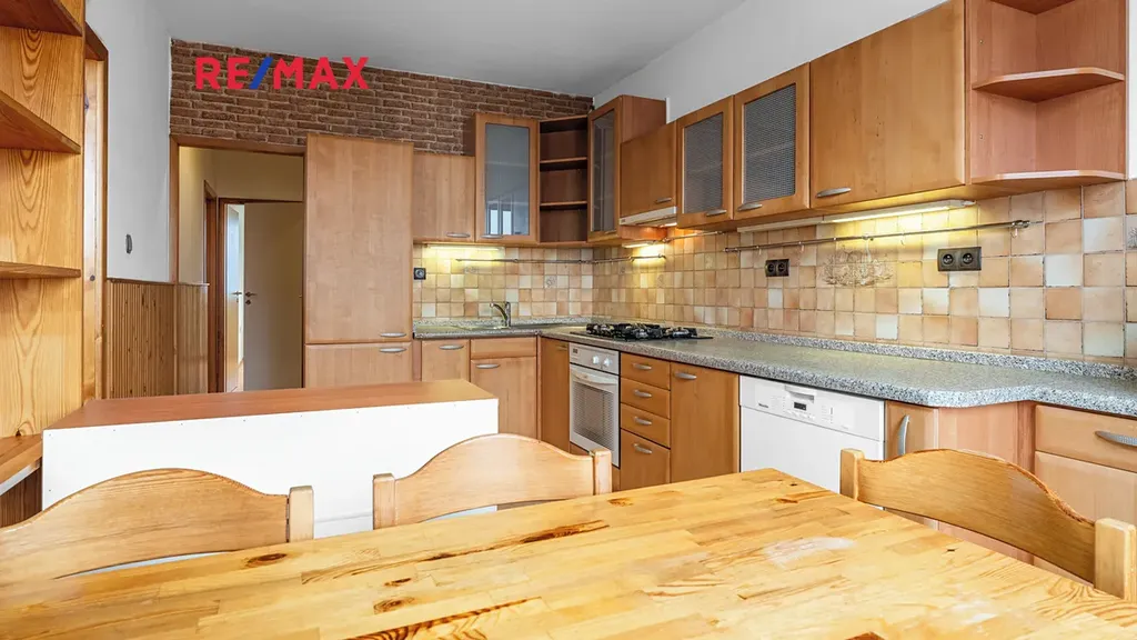 Kuchyně je samostatná s kuchyňskou linkou ve starším, ale velmi udržovaném a zcela funkčním provedení. Byt je tedy připravený k okamžitému užívání, případně nabízí prostor pro modernizaci podle vlastního vkusu. Z kuchyně se vstupuje do obývacího pokoje, ze kterého vejdete na lodžii s výhledem na celé město.