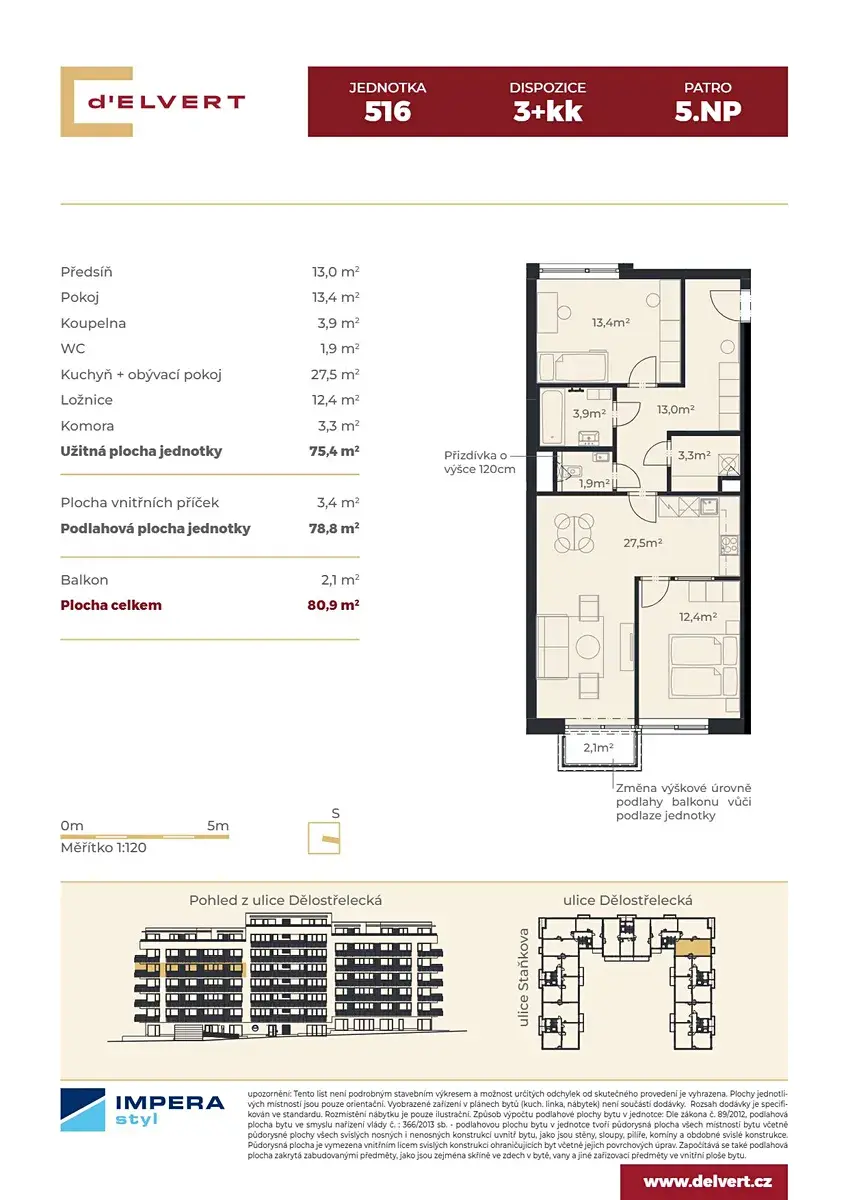 Jednotka má podlahovou plochu 78,8 m2 a nachází se v 5.nadzemním podlaží z celkových 8.