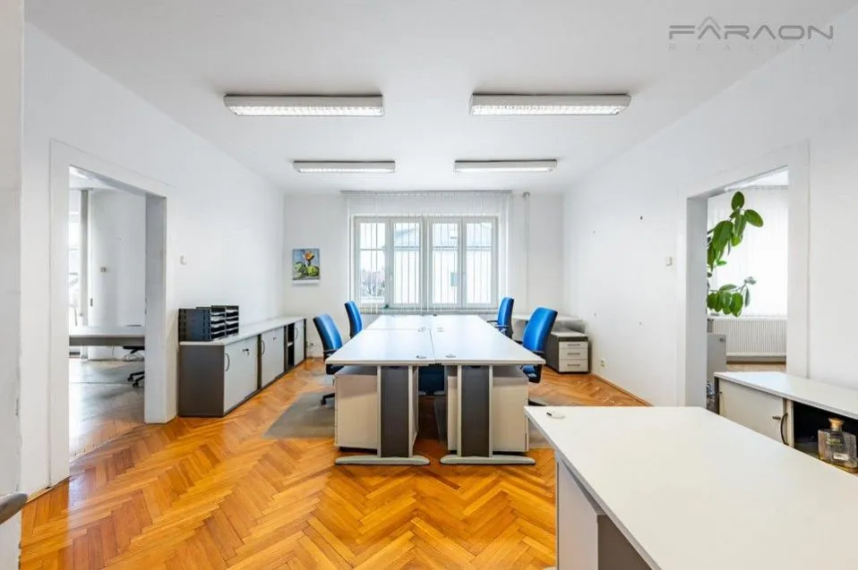 Kancelářské prostory jsou ve velmi dobrém stavu a vhodné k okamžitému užívání. Objekt je cihlový, vícepatrový a nabízí flexibilní uspořádání. Součástí vybavení je zabezpečovací systém Jablotron, který zajišťuje vysoký standard ochrany objektu. Dále je k dispozici parkování pro až 11 vozidel přímo na vlastním pozemku a možnost využití garáže.