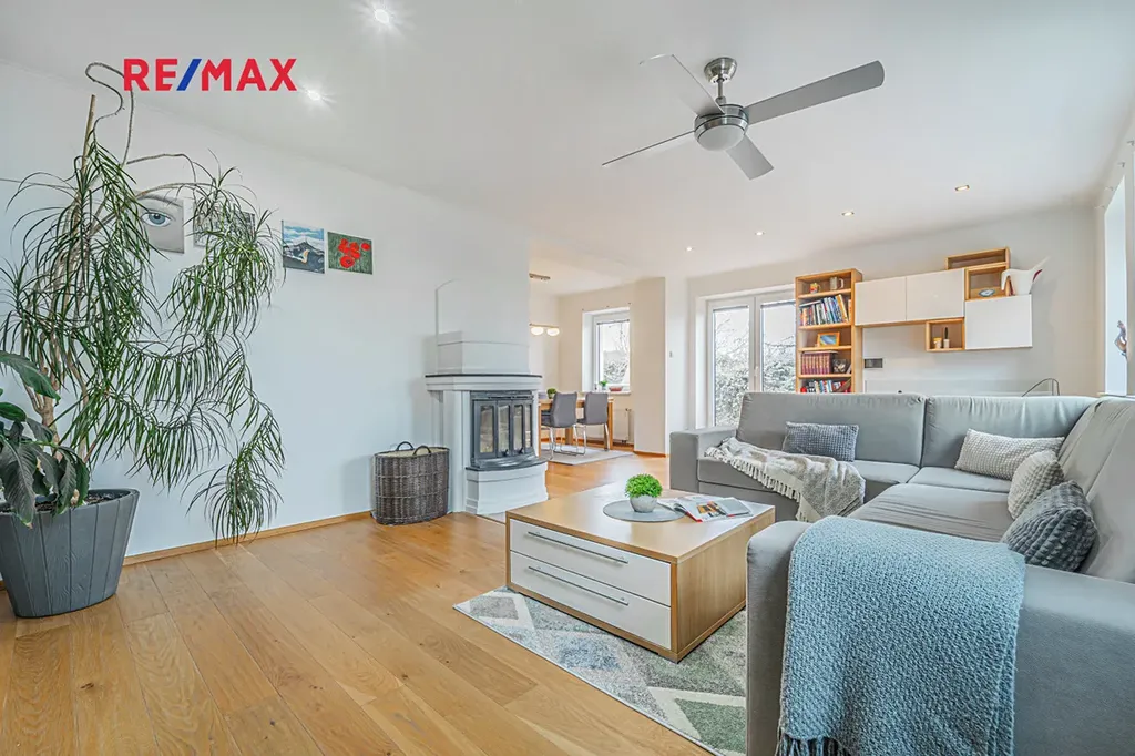 Přízemí domu tvoří prostorná vstupní hala s úložnými skříněmi na míru, ze které se plynule dostanete do moderní kuchyně s vestavěnými spotřebiči a kamennou pracovní deskou. Kuchyně navazuje na jídelní část a světlý obývací pokoj s krbovými kamny – místo, kde se přirozeně setkává celá rodina.