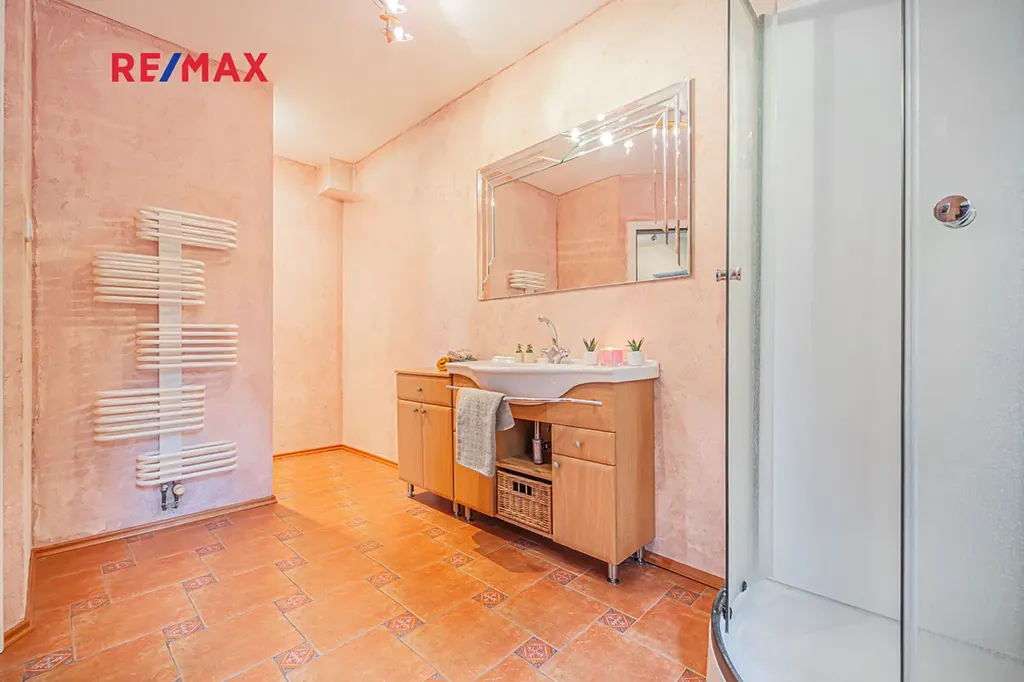 V patře najdete dvě dětské ložnice, hlavní ložnici, pracovnu a druhou koupelnu s vanou, sprchovým koutem a toaletou.
