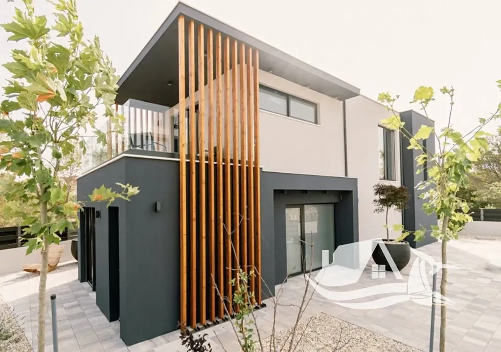 Pouhých 350 metrů od moře, v blízkosti historického města Šibenik, se nachází moderní designová vila, která dokonale spojuje současnou architekturu s uvolněným středomořským životním stylem. Tato nemovitost nabízí ideální rovnováhu mezi soukromím, komfortem a atraktivní polohou u pobřeží.