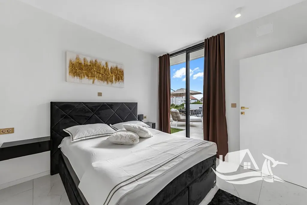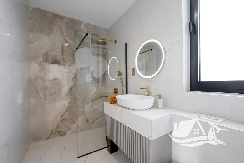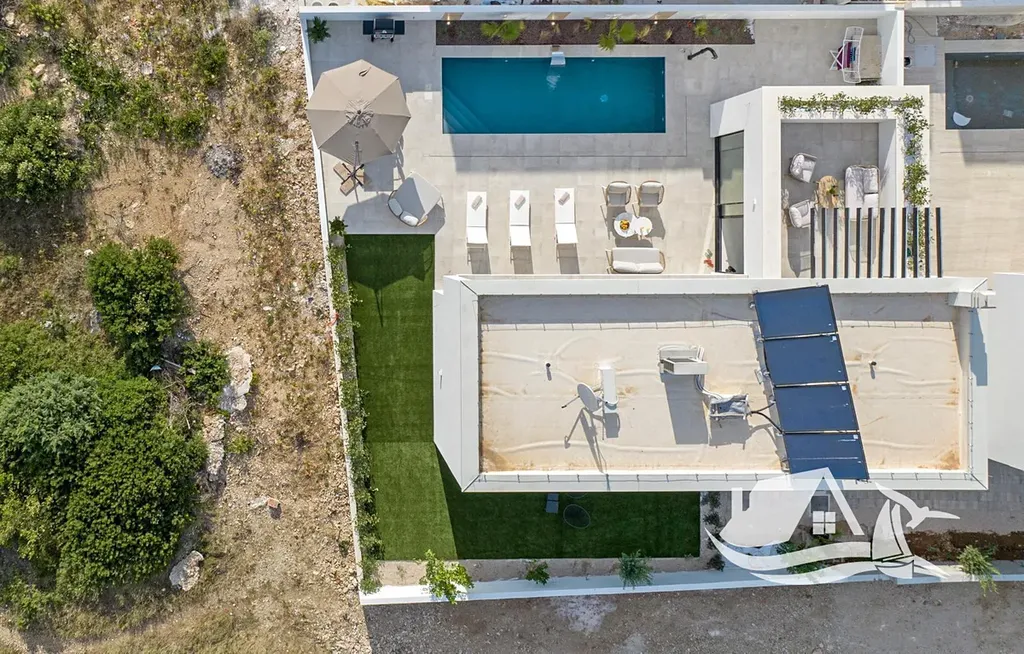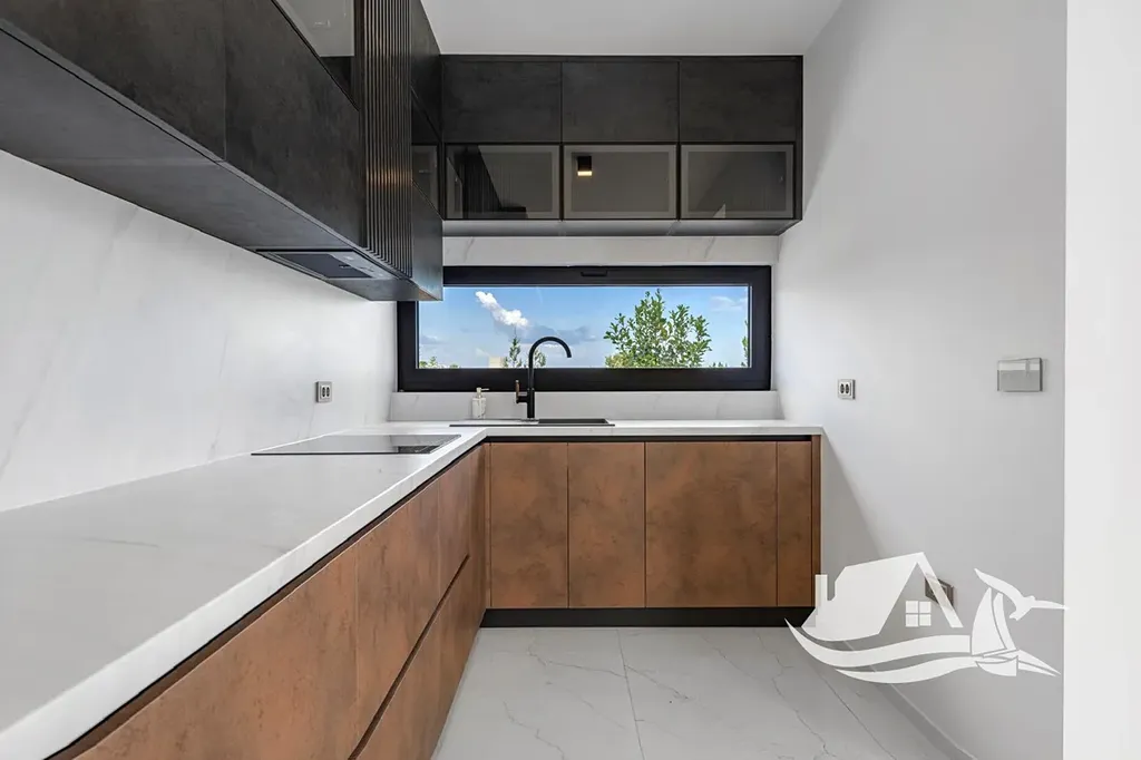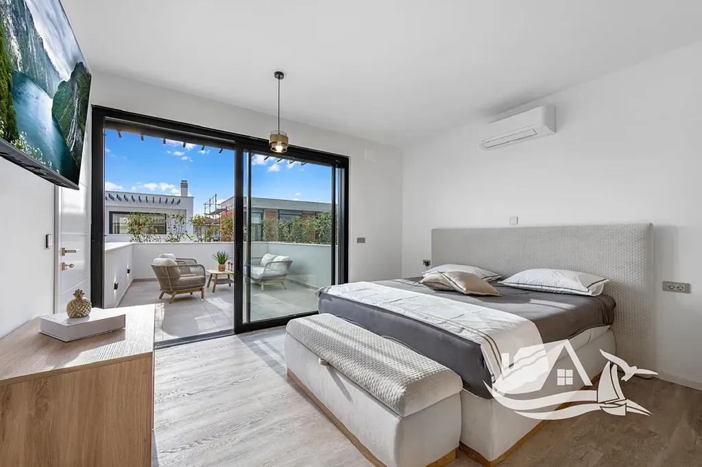 Celková užitná plocha činí 182 m², z toho 150 m² obytné části. Dispozice je rozložena do dvou podlaží. V přízemí se nachází vstupní hala, samostatné WC s pračkou, prostorná ložnice s vlastní koupelnou a moderní kuchyně propojená s jídelnou a obývacím pokojem. Odtud je přímý vstup na terasu a do soukromé zahrady o velikosti přibližně 150 m² s bazénem, sluneční terasou a venkovním grilem. První patro nabízí tři komfortní ložnice, každou s vlastní koupelnou, a vstup na zastřešenou terasu s panoramatickým výhledem na moře.