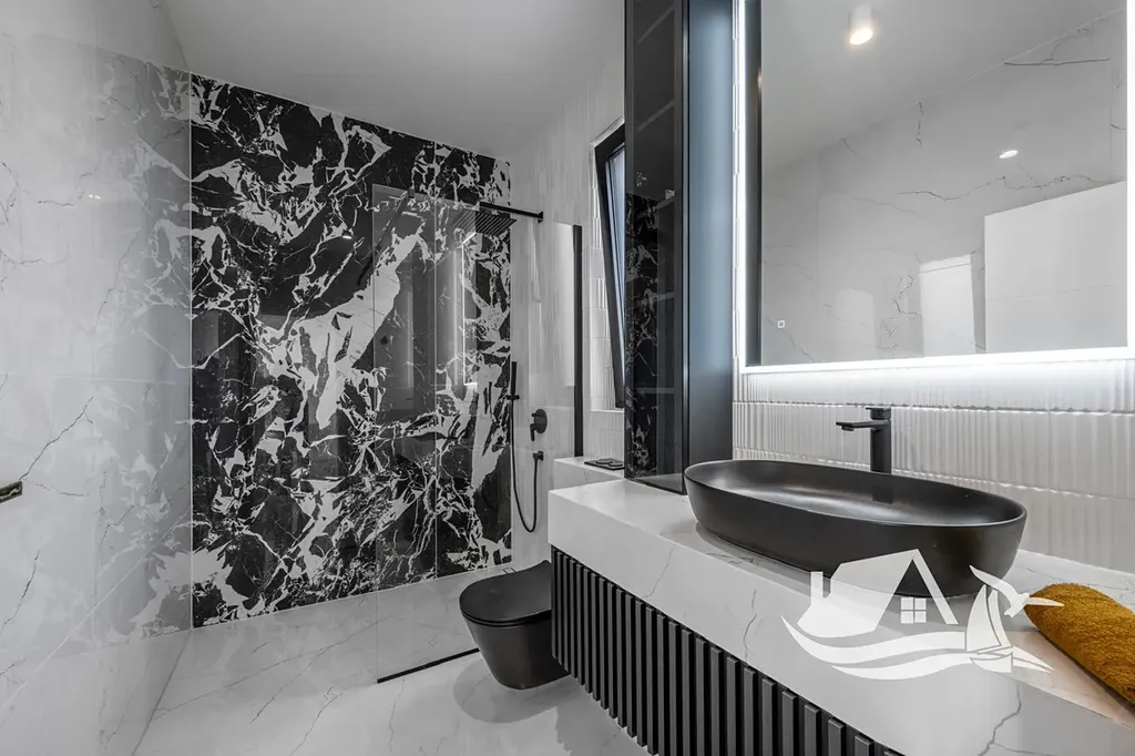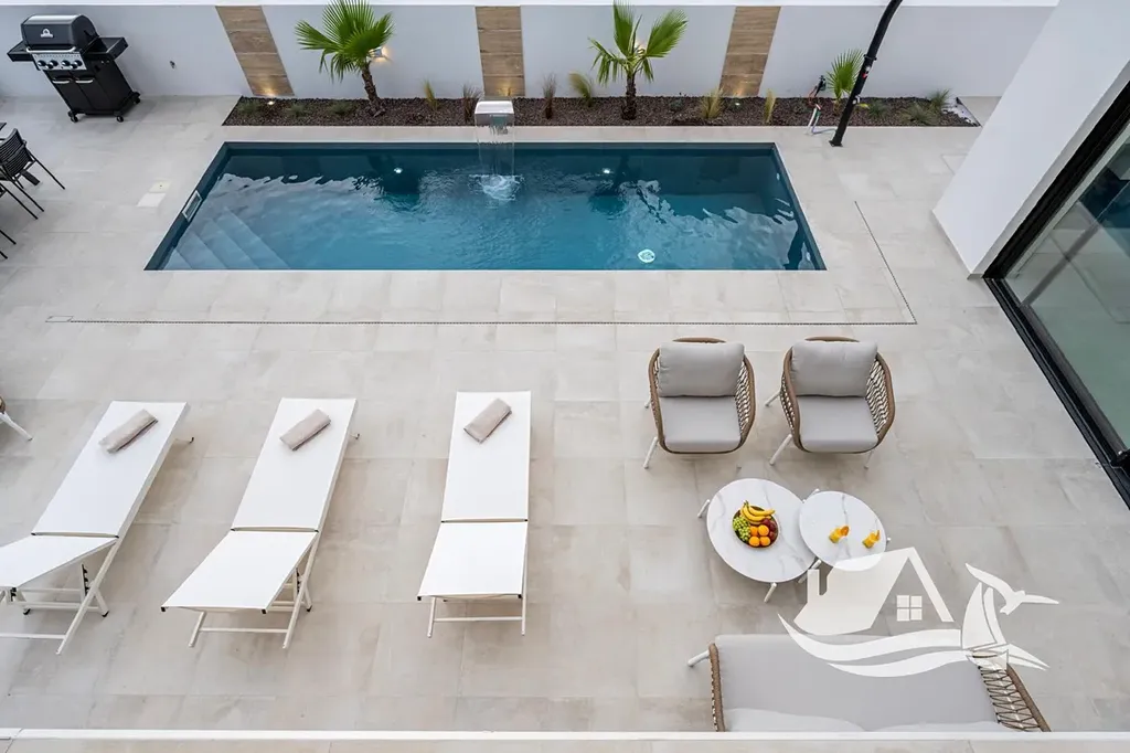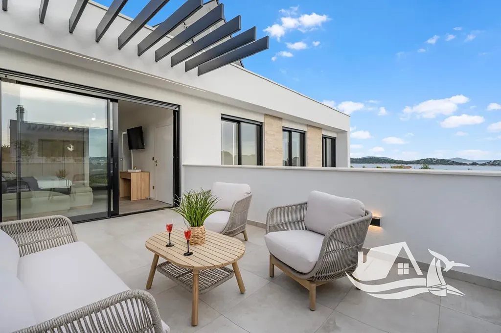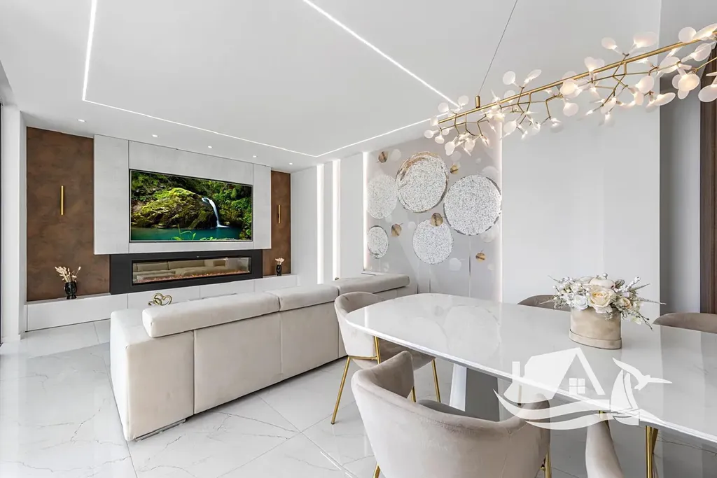 Celková užitná plocha činí 182 m², z toho 150 m² obytné části. Dispozice je rozložena do dvou podlaží. V přízemí se nachází vstupní hala, samostatné WC s pračkou, prostorná ložnice s vlastní koupelnou a moderní kuchyně propojená s jídelnou a obývacím pokojem. Odtud je přímý vstup na terasu a do soukromé zahrady o velikosti přibližně 150 m² s bazénem, sluneční terasou a venkovním grilem. První patro nabízí tři komfortní ložnice, každou s vlastní koupelnou, a vstup na zastřešenou terasu s panoramatickým výhledem na moře.