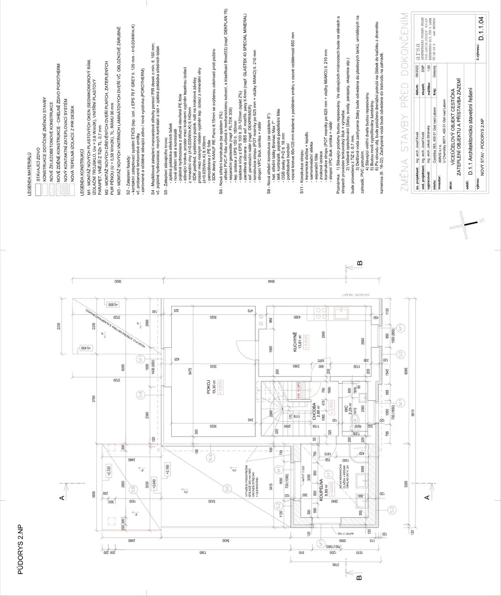 Stávající podlahová plocha 1. NP je cca 58 m2, 2. NP je cca 64 m2, 3. NP je cca 51 m2 a půdy cca 51 m2. Jednotlivá patra jsou přístupná z centrálního schodiště. Kuchyň a koupelna v obou patrech mají okna na severní stranu do ulice, obývací pokoj a ložnice mají okna situovaná na jihovýchodní, slunnou stranu.