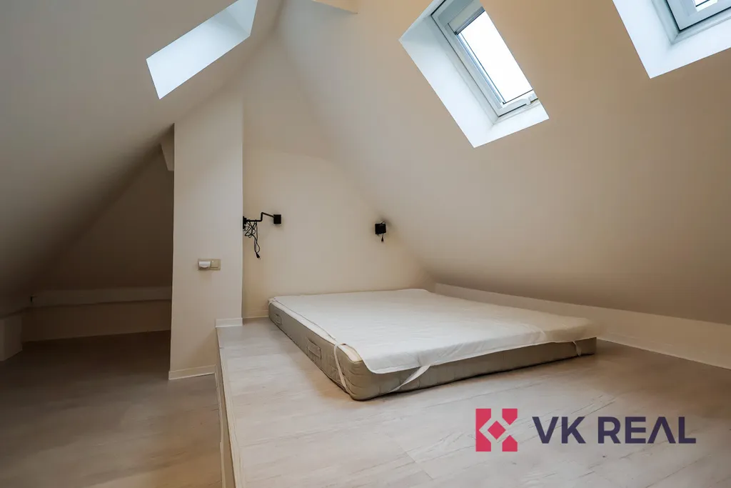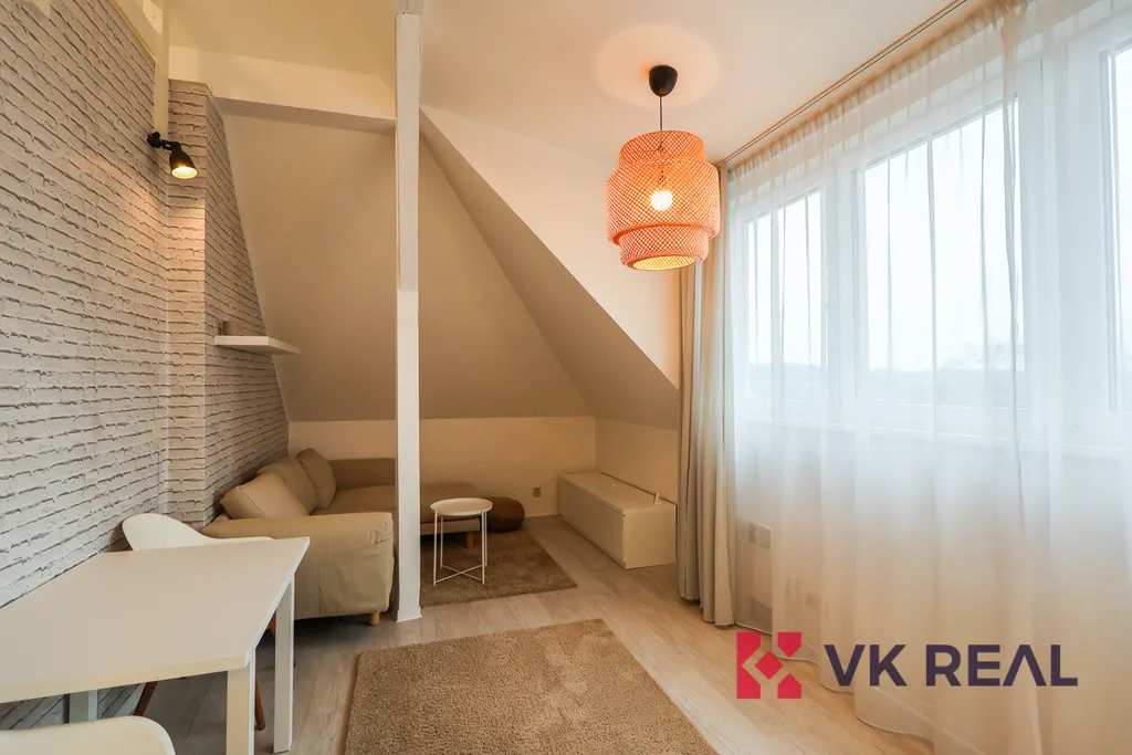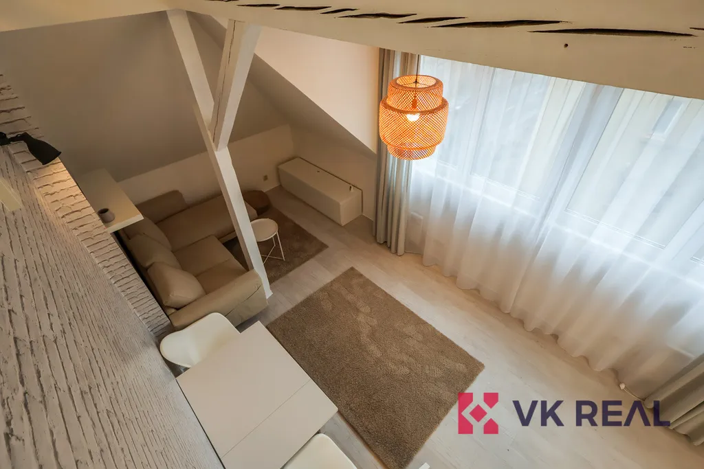 Designový byt se nachází ve třetím podlaží vily. Jedná se o loft zaujímající dispozici 1+kk a obytnou plochu 50m2 a pronajímá se zařízený dle fotografií. Dispozice je rozdělena následovně: ve spodním patře se nachází obývací pokoj s kuchyňskou linkou a koupelna se sprchou a WC. Horní část bytu tvoří patro pro spaní. Kuchyňská linka je plně vybavena spotřebiči značky Elektrolux, v úložných vestavěných prostorách v předsíni je umístěna pračka, též značky Elektrolux. Vytápění je řešeno elektrickými přímotopy, ohřev teplé vody elektrickým bojlerem.