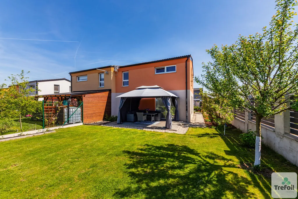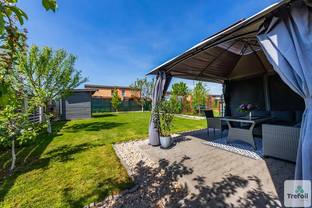 Zahrada pro relaxaci i zábavu o rozloze 256 m² je pečlivě upravená a nabízí ideální prostor pro odpočinek i rodinné aktivity. Jsou zde zasazené ovocné stromy a je tu i místo pro zeleninový záhon. Na terase si můžete vychutnat ranní kávu či večerní sklenku vína, zatímco děti si budou hrát na trávníku. Nářadí a zahradní potřeby lze pohodlně uložit v zahradním domku.