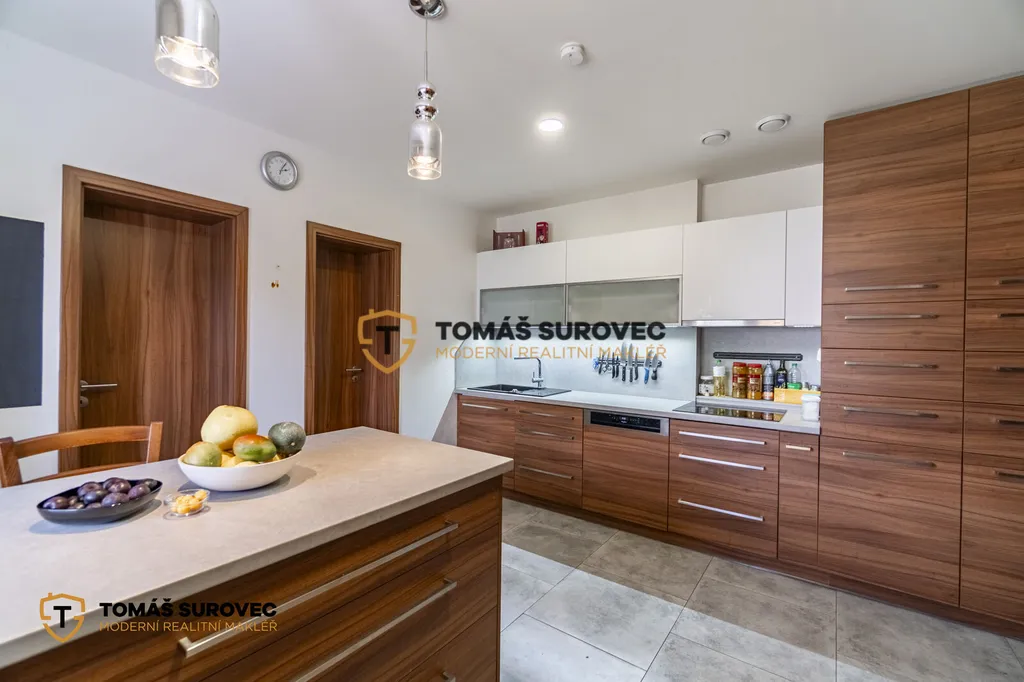 Kuchyň se nachází je v 1. patře a je společná s majitelem domu. Je vybavena myčkou, sporákem, mikrovlnou troubou , lednicí s mrazákem.