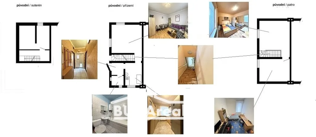 Vstupní části je chodba, z níž se dostanete do koupelny a nebo do sklepa. Sklep se nachází pod obývacím pokojem. Kuchyň je částečně průchozí do obývacího pokoje. Mezi obývacím pokojem a kuchyní se nachází schodiště, které Vás dovede průchozích pokojů.