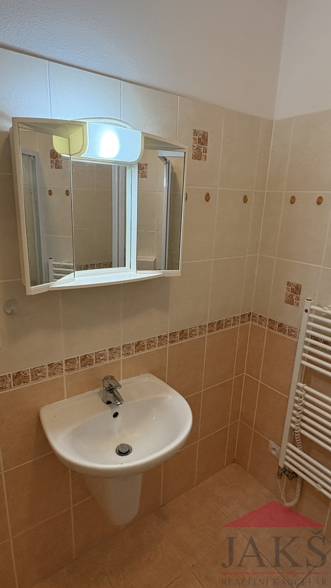 Popis: společná chodba se schodištěm a výtahem; byt 2+kk: předsíň 3,78 m2 (skříň s botníkem a věšákem), koupelna 3,42 m2 (sprchový kout, umyv. se zrcadlem, WC, topný žebřík, vývody na pračku), prostorný obývací pokoj 26,45 m2 (sedací souprava, jídelní a konferenční stůl, 4 židle, skříně, poličky) s kuch. koutem (kuch. linka s el. troubou a lednicí s mrazákem) a ložnice 9,02 m2. K bytu náleží vlastní sklep 3,71 m2 v suterénu domu a vymezené parkovací místo přímo před vchodem do domu.