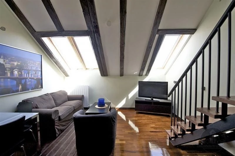 Byt se sestává z obývacího pokoje s kuchyňským koutem, 2 ložnic, 2 koupelen + WC, v 5 patře. Byt je zařízený. Nájem: 26 000, Kč + 1100, Kč domovní služby za osobu (vodné, stočné, úklid domu, výtah, osvětlení v domě atd.) + revize kotle 220 Kč/měsíc + elektřina a plyn na vlastní náklady. Volný ihned. Domácí zvíře dovoleno.