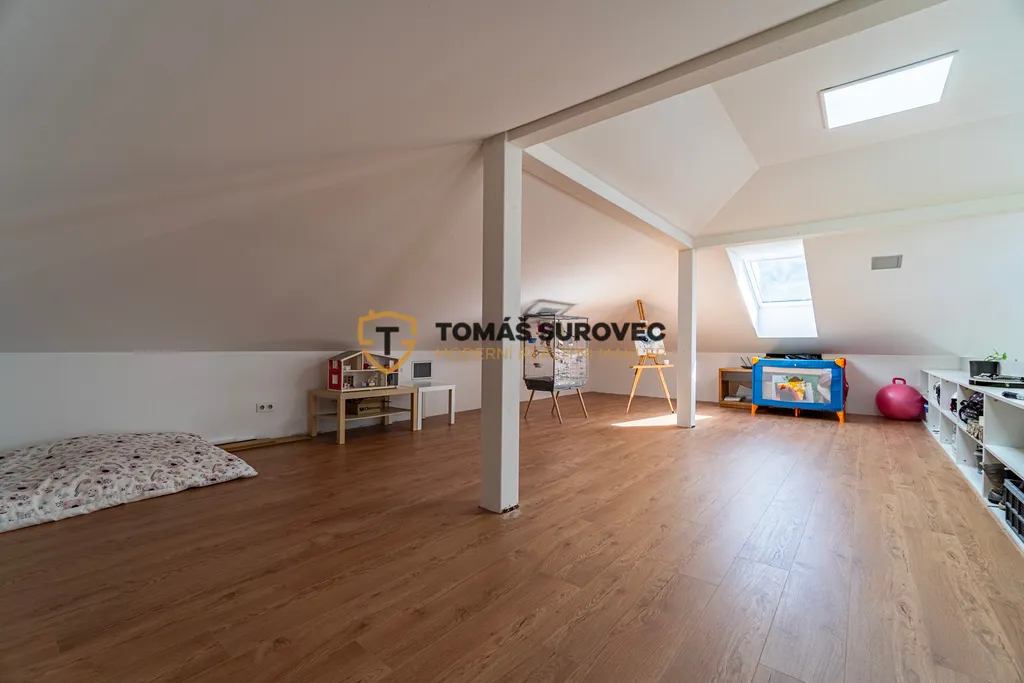 Soukromou část domu tvoří ložnice s vlastní šatnou a dva neprůchozí dětské pokoje. K dispozici je samostatné WC a luxusní koupelna s volně stojící vanou, sprchovým koutem a dvěma umyvadly.