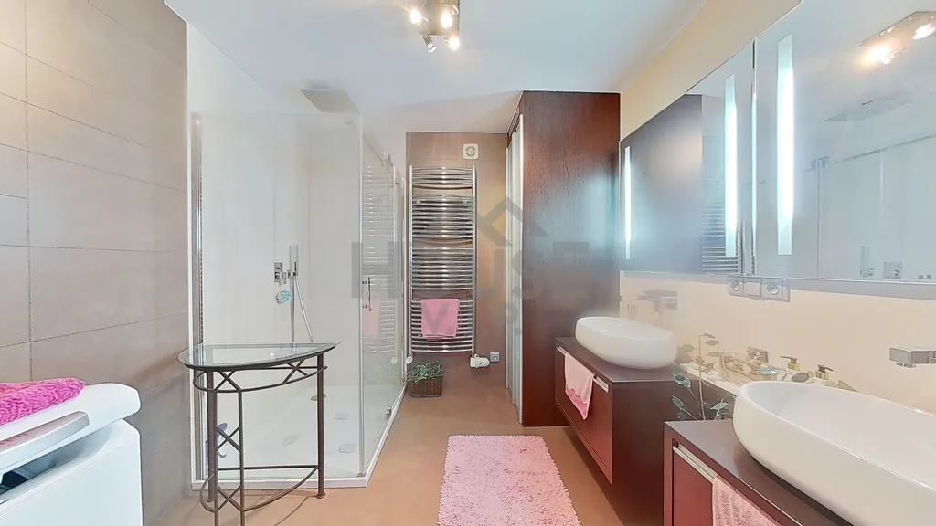 Tento impozantní byt s orientací na V a Z, byl celý navržen. architektem v italském designu. Má vestavěné 2. patro, ve kterém se nachází ložnice a prostorná koupelna s masážní vanou s osvětlením a toaletou. Prvnímu patru dominuje velký obývací pokoj s designovým schodištěm v kombinaci dřevo/kov a s moderním kuchyňským koutem s veškerými zabudovaným elektrospotřebiči. Obytná část je oddělena osvětleným pultem s kamennou deskou (Technistone). Z obývacího pokoje se vstupuje do dalšího pokoje s rozsáhlou skříňovou sestavou; další koženou sedačkou, relaxačním koutem a vstupem na terasu. Ve spodním patře se dále nachází druhá prostorná koupelna se sprchovým koutem, dvěma umyvadly a pračkou. Je zde rovněž samostatné WC s malým rohovým umyvadlem.