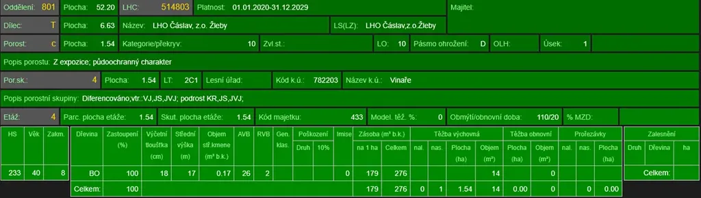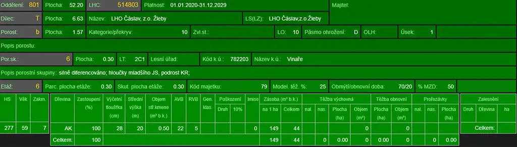 - p.č. 1594 vedená jako lesní pozemek o celkové výměře 16 324 m2, z toho vlastníme podíl 2/3 tedy 10 883 m2 (stáří lesa 65 let - zastoupení dřevin akát, stáří lesa 46 let - zastoupení dřevin borovice).