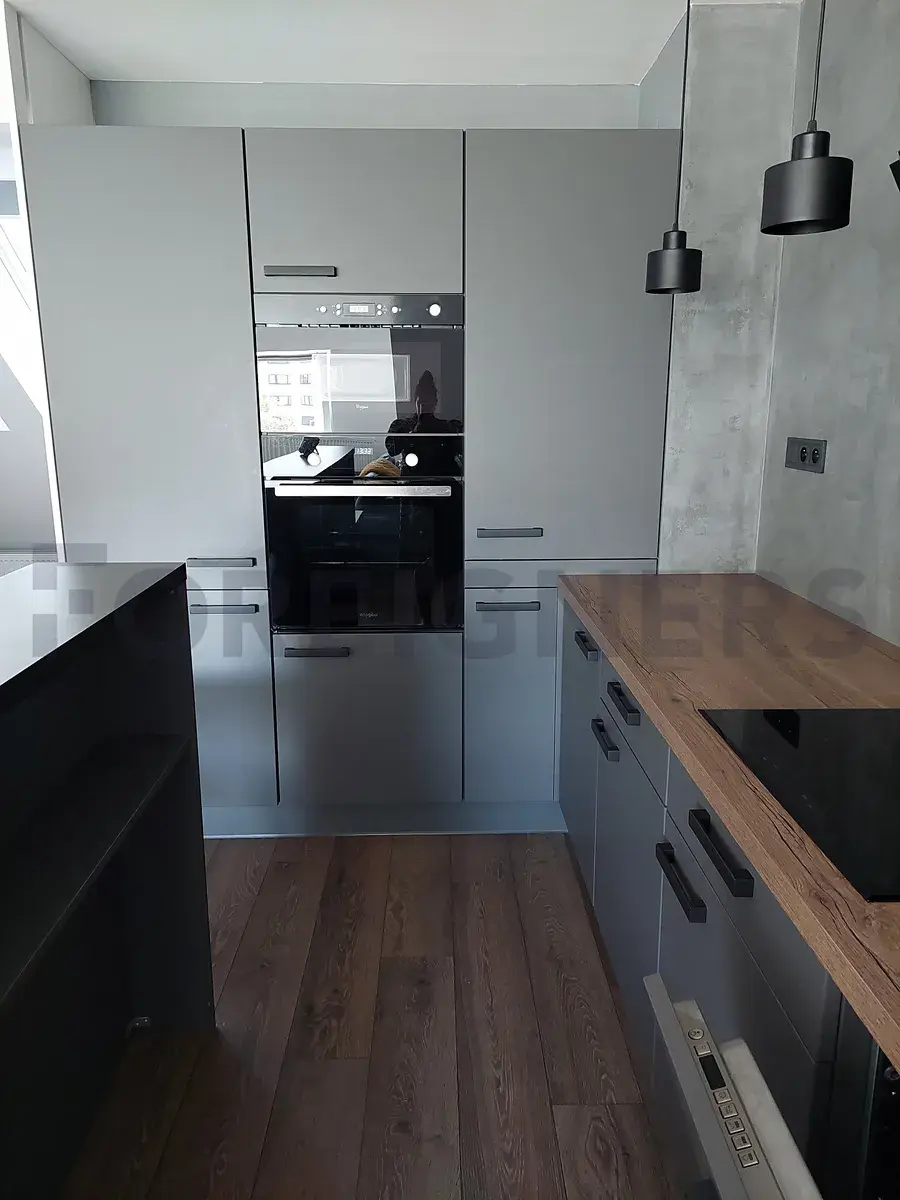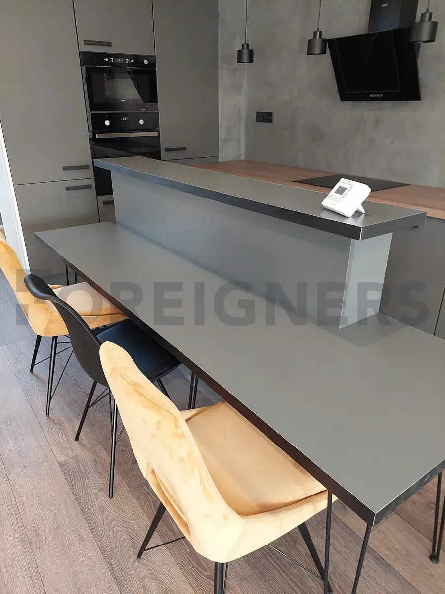 Kuchyň s kuchyňskou linkou, indukční deskou s troubou, ledničkou, mrazákem, mikrovlnnou troubou, digestoří, barem, jídelním stolem se 4 židlemi. Obývací pokoj se sedačkou, konferenčním stolem, PC stolem a TV stolkem.